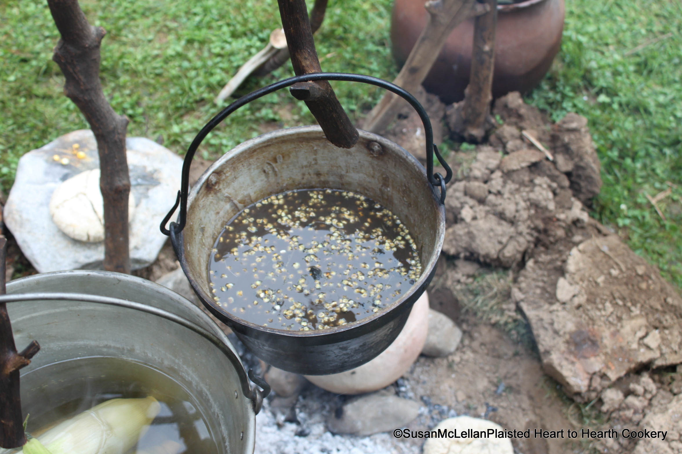 As the Lenape blue flour corn kernels sit in the alkali mixture of sifted ash and water, the process of nixtamalization begins. Ultimately the pericarp (hulls) will be removed from the kernels which makes them more easily ground into flour, the nutritional value will be enhanced, and the flavor and aroma of the corn improved.