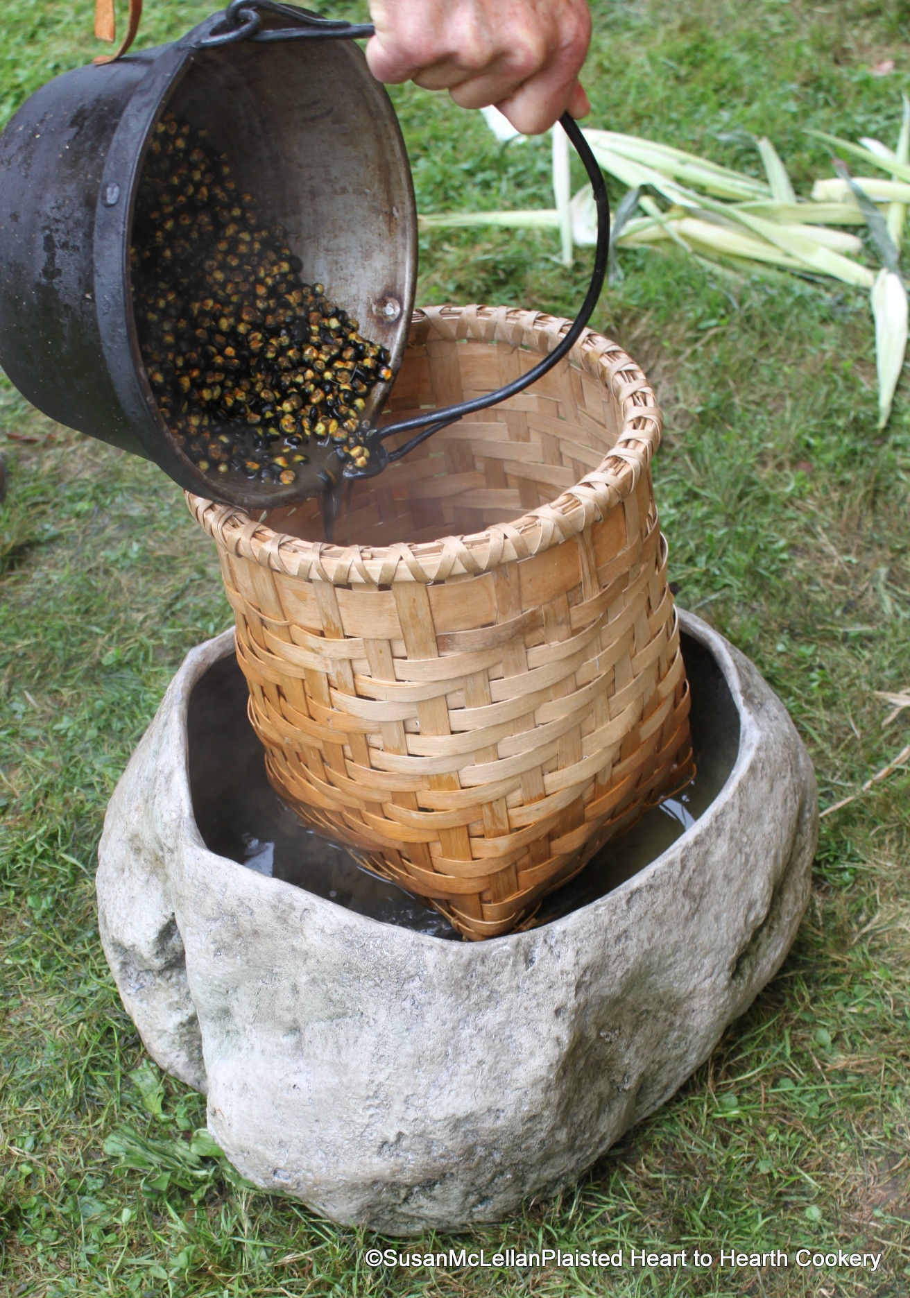 Without the ability to take my lyed Lenape blue flour corn and reproduction hominy basket to nearby flowing water, the water was changed frequently in this “rock” vessel until the corn was washed with the hulls floating to the surface. (See previous posts for more information on the nixtamalization process)