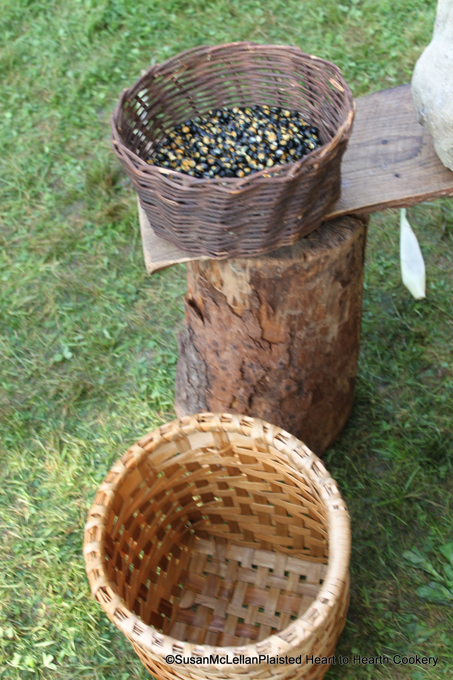 The Lenape blue flour hominy is now wet and without hulls in the grapevine basket with my reproduction hominy basket on the ground. The nutritional value of the blue corn has been improved with the nixtamalization process.