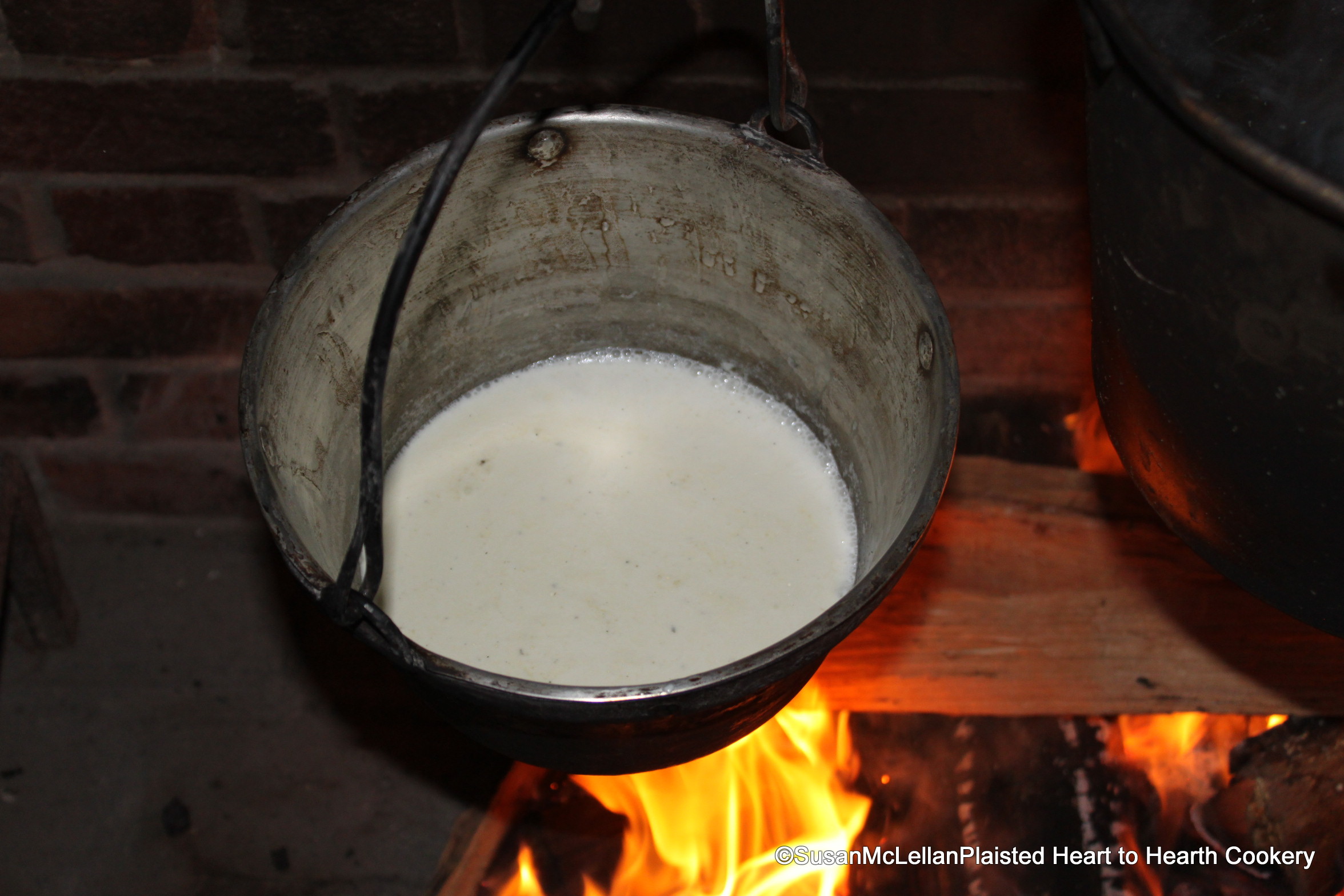 Take a pint of Crème, and put an Nutmeg Cutt in quarters in to it and sett it over the fire till it bee ready to boyle. This is the first line of a 17th century receipt (recipe) for Too Make a Hedg Hogg Pudding. You can see the tiny bubbles just beginning to emerge by the sides of the kettle but the quartered nutmeg is not visible. The cream is ready for the next step.