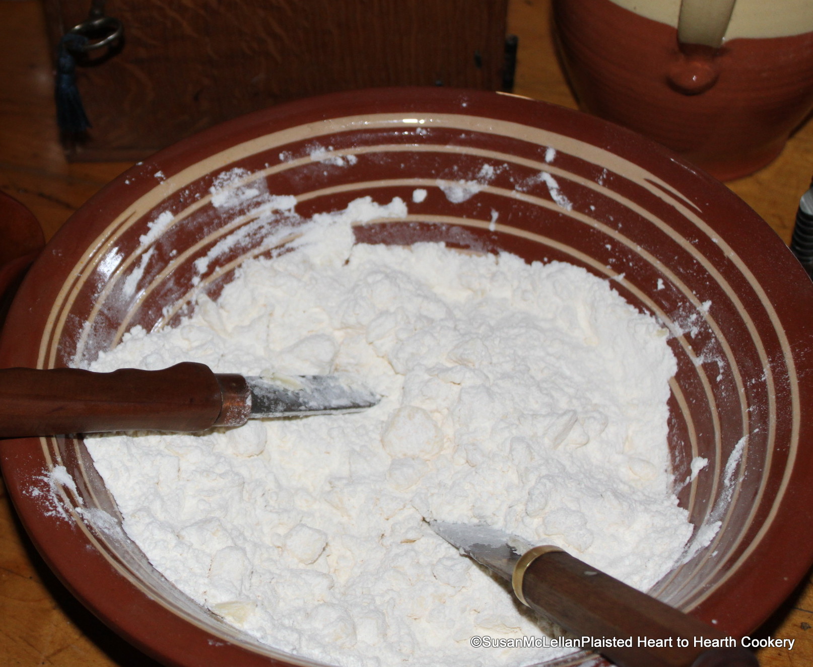In the 18th century, the word pudding evolved to what today would be considered a one-crust pie. This Pompkin pudding starts with Paste No. 3. To any quantity of flour, rub in three forths of its weight of butter, rub in one third or half, and roll in the rest. I used my balance scales to determine three forths of the flour’s weight in butter and now am using knives to rub in about a half of the total butter.