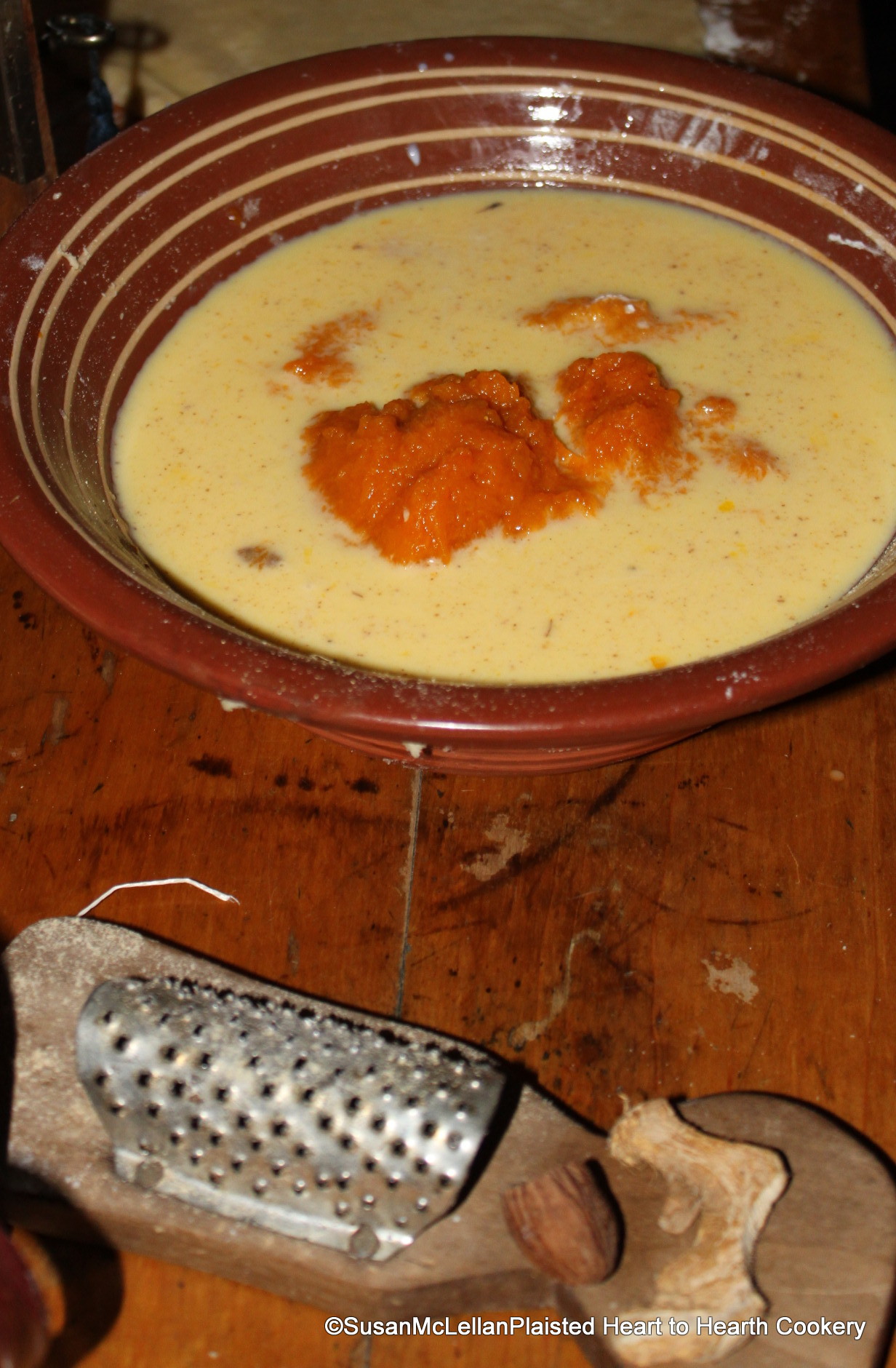 The filling for the Pompkin pudding was prepared with one quart stewed and strained (pumpkin), 3 pints milk, six beaten eggs, sugar, mace, nutmeg and ginger. The nutmeg and ginger are on the wood handle of my grater and were grated into the bowl.