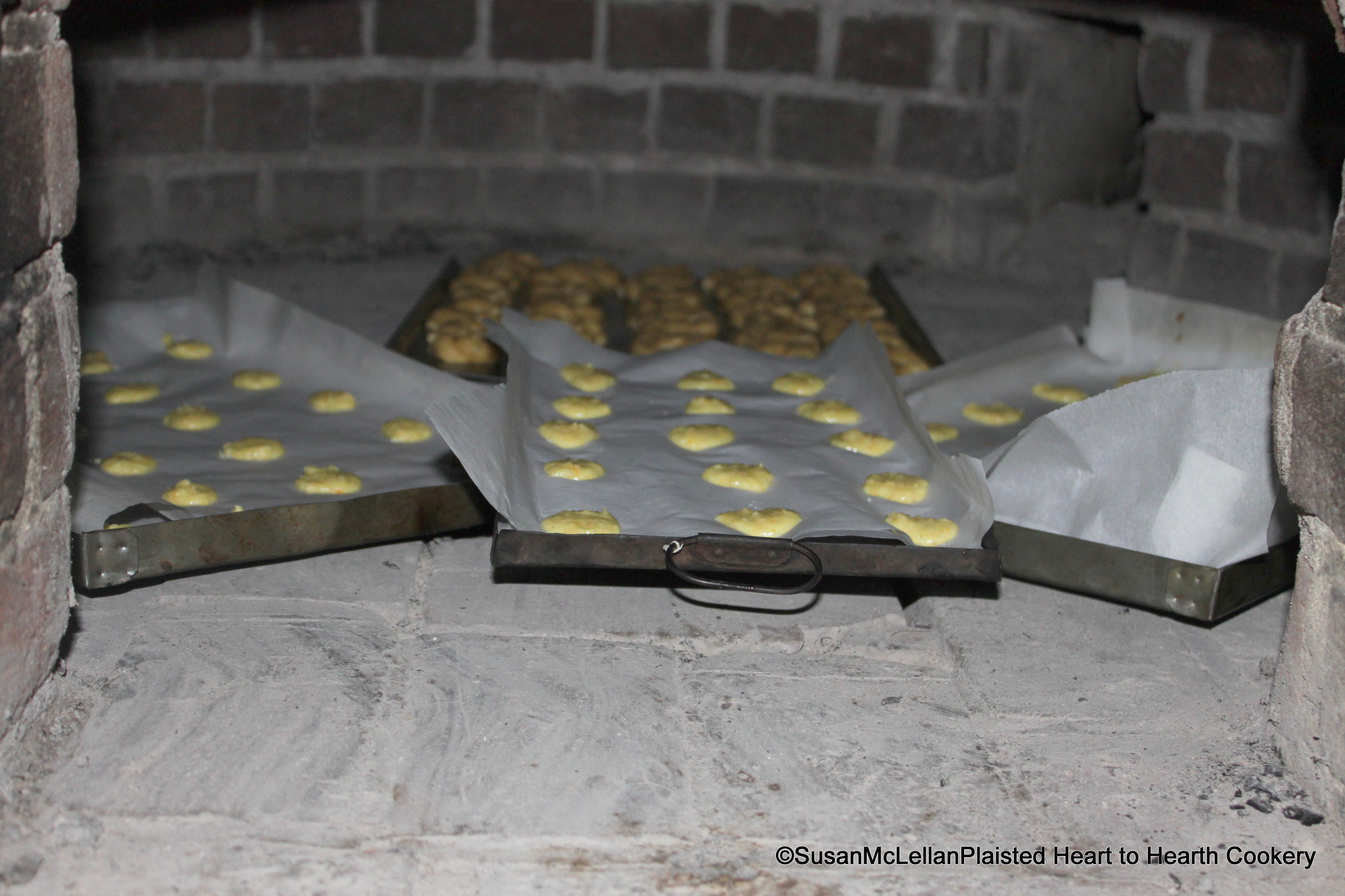 To bake the Orange Biscuits the receipt (recipe) directed to then put two or three sheets of paper under, besides that you have put them on: let your oven be of moderate heat; drop little round pieces of paste on your paper, about half as big as a nutmeg, and put them in the oven. The paste has already started spreading from the heat of the oven when this picture was taken.