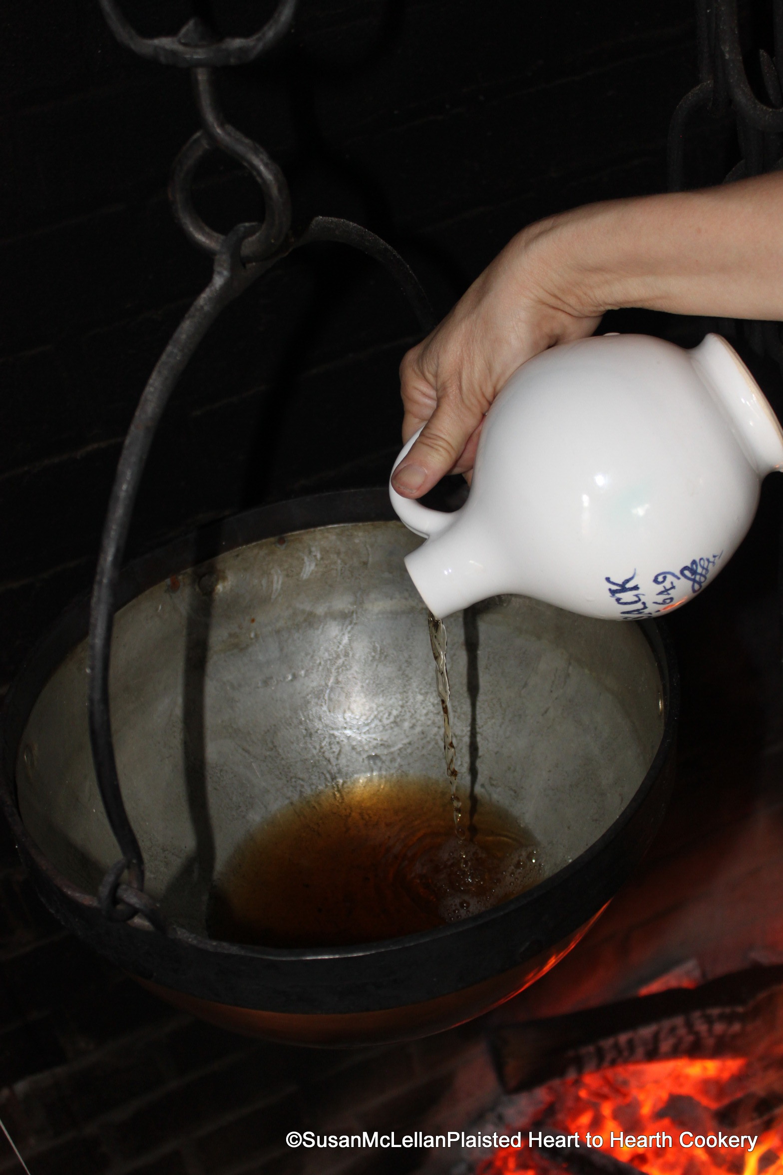 The receipt (recipe) for My Lord of Carlisle’s Sack Posset, directs to set the Bason on the fire with the Wine and Eggs. In place of a Bason, I used a hemispherical kettle for keeping these ingredients hot.. Pictured, I am pouring a pint of Sack (very dry sherry) into the kettle.