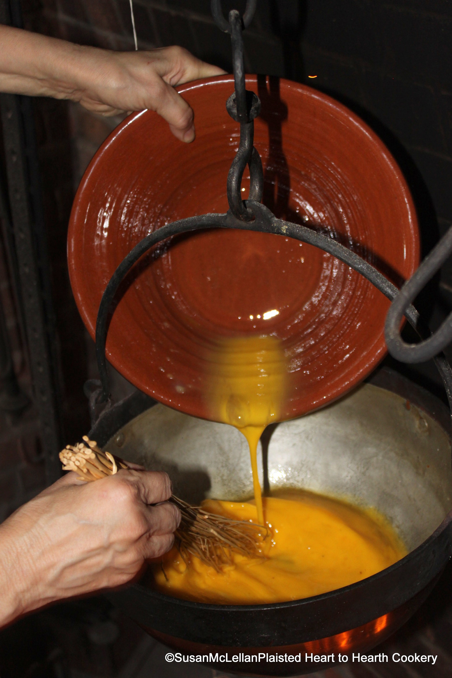 The receipt (recipe) for My Lord of Carlisle’s Sack Posset states to put in eighteen yolks of eggs, and eight of the whites beaten very well and then mingle them with your Sack. The eggs were added slowly to the sack in the hemispherical kettle that was just beginning to warm. A birch twig whisk was used to mingle the eggs and wine.