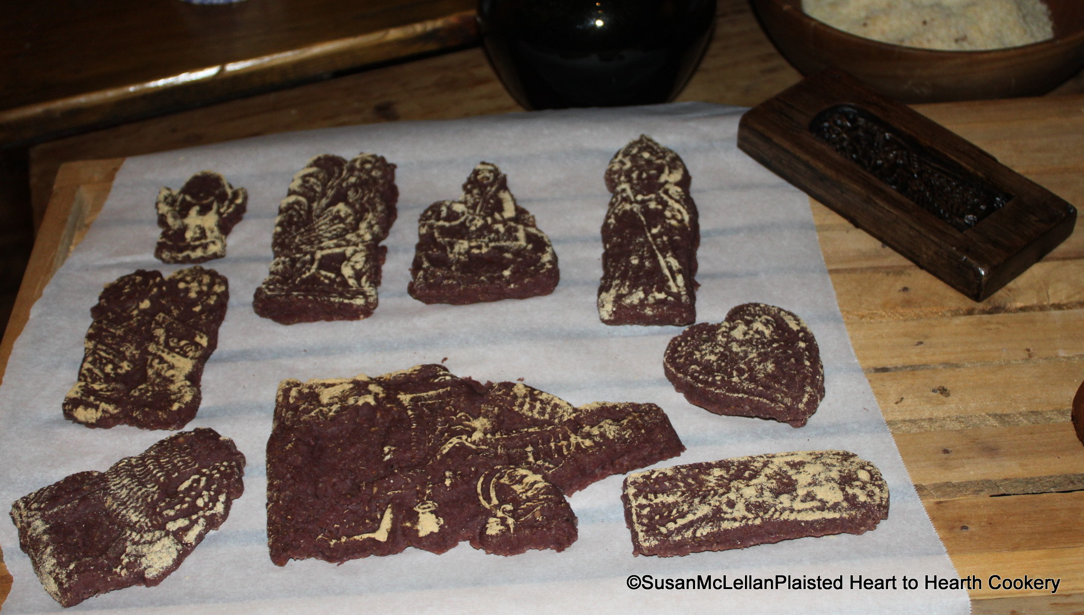 When the grated bread, ginger, cinnamon, aniseeds, and claret wine have been combined to a stiffe paste for the receipt (recipe) To make Ginger Bread, the paste is driven thin and printed in the moldes. Dust your moldes with Cinamon, Ginger, and liquorice beeing mixed together in fine powder. One of my reproduction Laxa family gingerbread molds, Mini-Madonna (circa 1670) is to the right of the molded gingerbread.