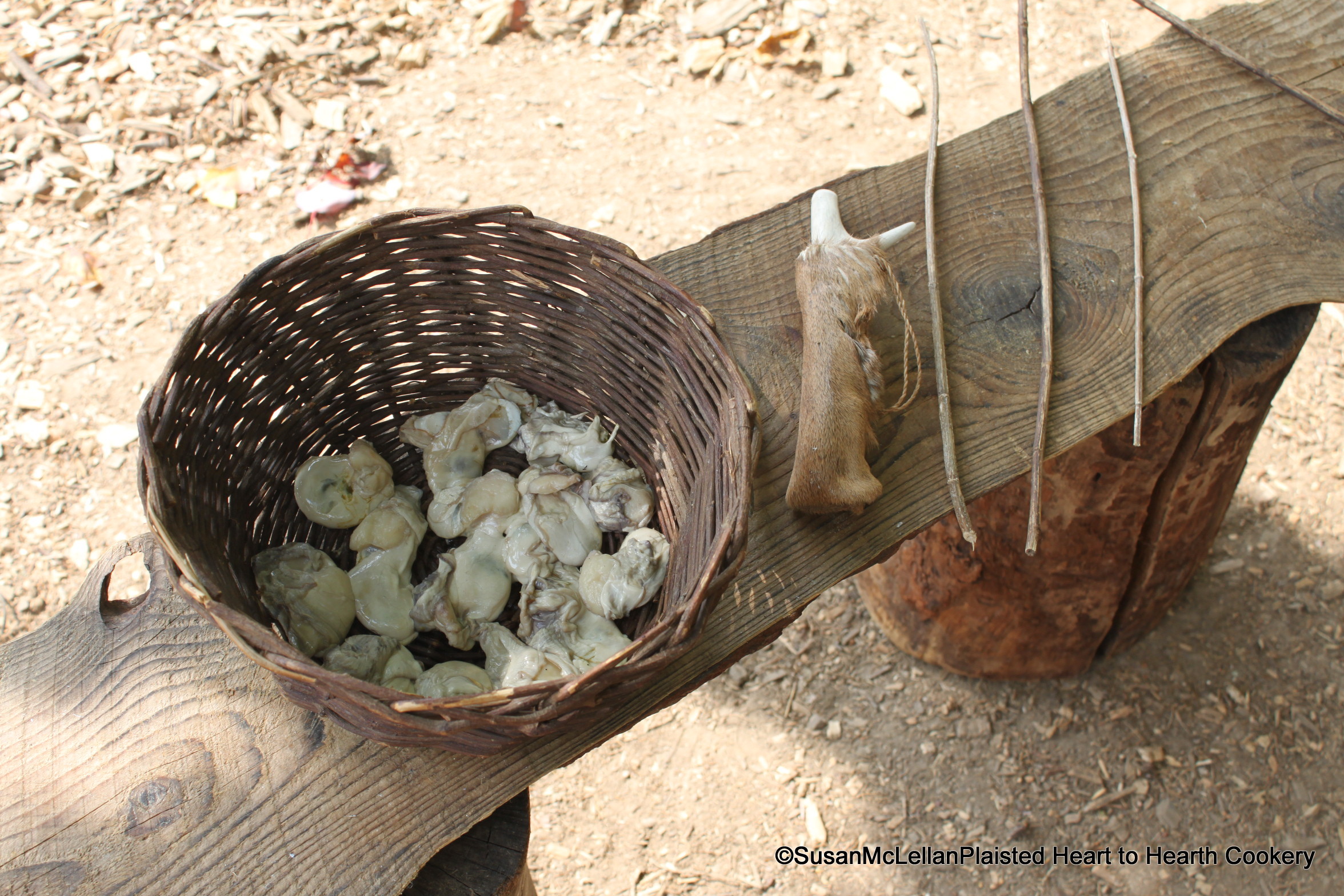 To keep harvested oysters for future use, oysters were dried in the sun by the Eastern Abenaki. In preparation for drying oysters in the sun, I have a grape vine basket with oysters, a deer bone awl in a deer skin holder and nettle sticks.