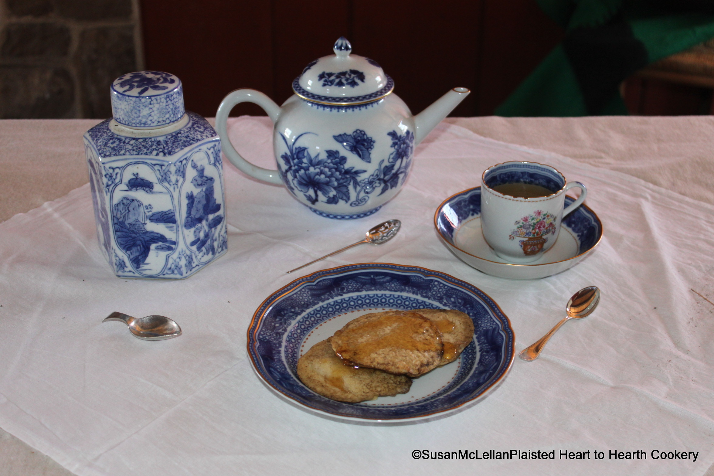 George Washington’s breakfast of three small mush cakes swimming in butter and honey has been served on a porcelain plate with a blue and white Fitzhugh border pattern. And George drank three cups of tea without cream. The finest green tea is in the blue and white porcelain tea caddy to be added to the pot with the tea caddy spoon. The mote spoon (in front of the tea pot) is ready to remove any floating tea leaves in the cup or unclog the tea spout.