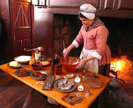 This photograph by Rick Epstein shows on the table from right to left re-creations of English gingerbread receipts (recipes) from 15th, 16th, 17th and 18th century and captures my program on the Evolution of Gingerbread at the hearth.