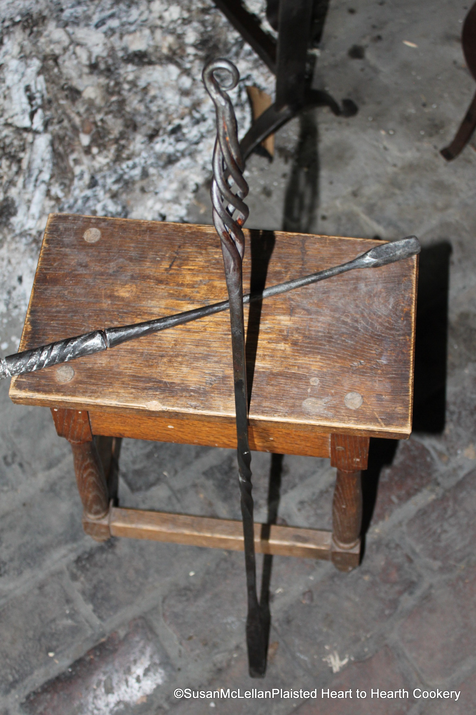 Pictured are two of my reproduction mulling irons. The ends that were heated in the hot embers and used to heat the ale or wine are to the right and on the floor. The iron would be tapped to remove ash and then inserted in the beverage to heat.