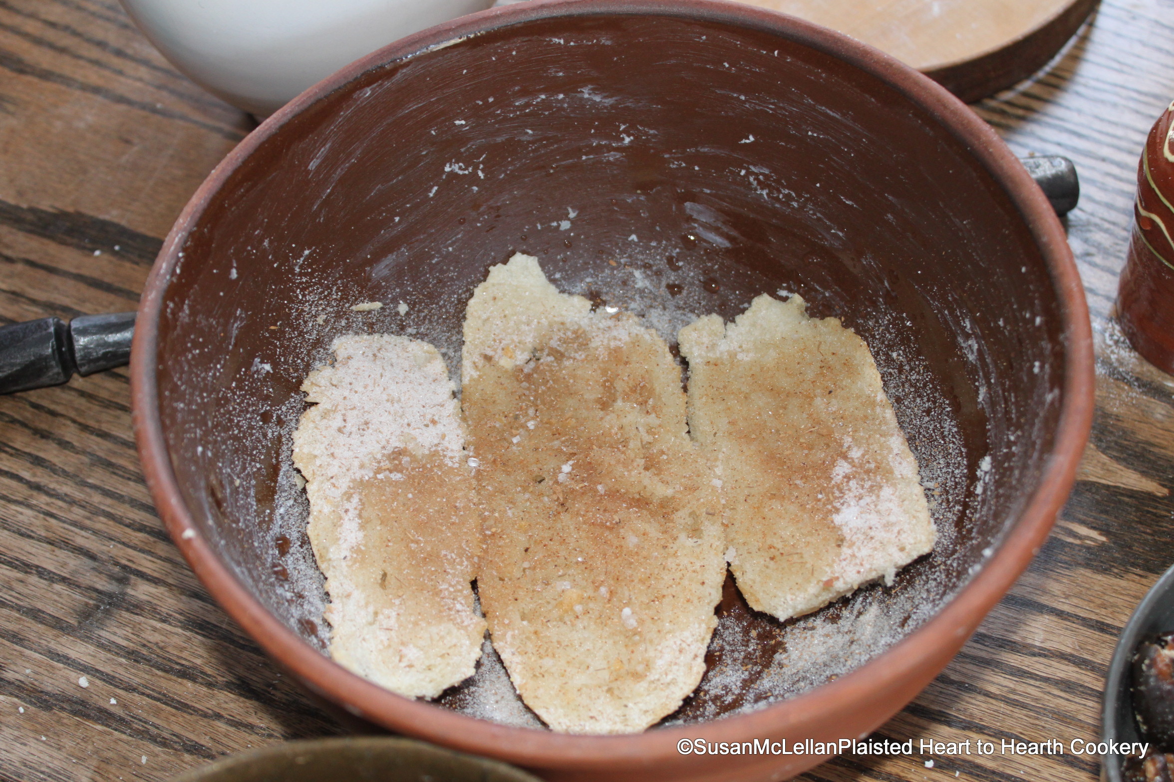 The instructions written by Robert May To make a most rare excellent Marrow Pudding in a dish baked… are the following: Now have a fine deep large dish, then have a slice of French bread, and lay a lay of sliced bread in the dish, and strew it with sugar, cinnamon and nutmeg mingled together, and also sprinkle the slices of bread with sack and rose-water… In the deep redware dish are three slices of bread. The sprinkling of the bread with sack (very dry sherry) and rose-water infuse the spices and flavor into the bread.