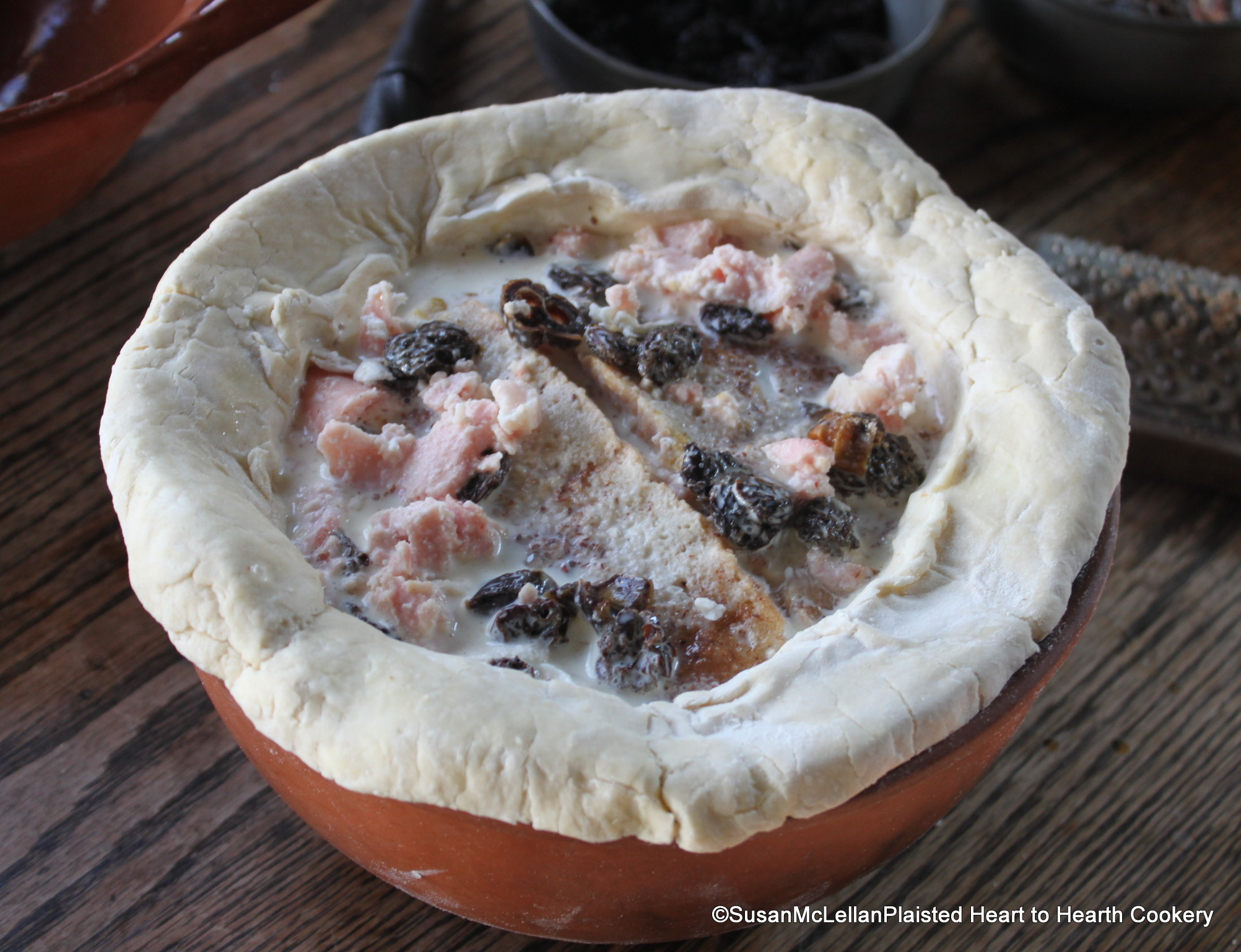 Prior to baking, all the layers of the receipt (recipe), To make a most rare excellent Marrow Pudding in a dish baked, are covered with a mixture of cream, sugar, salt, and eggs. The entire receipt name is: To make a most rare excellent Marrow Pudding in a dish baked, and garnish the Dish Brims with Puff past.