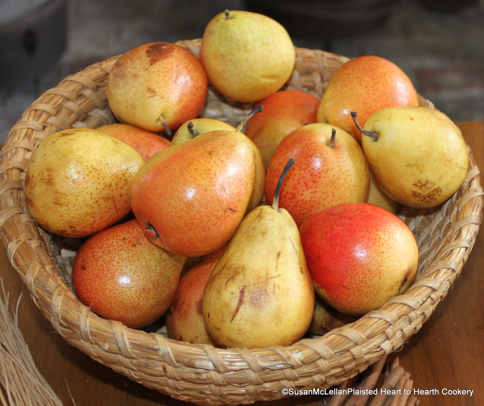 A basket of Forelle pears that were stored over the winter. Those that were in the worst condition were used first. This pear is a very old variety and originated in the 17th century in northern Saxony, Germany. The name, Forelle, means trout in German.