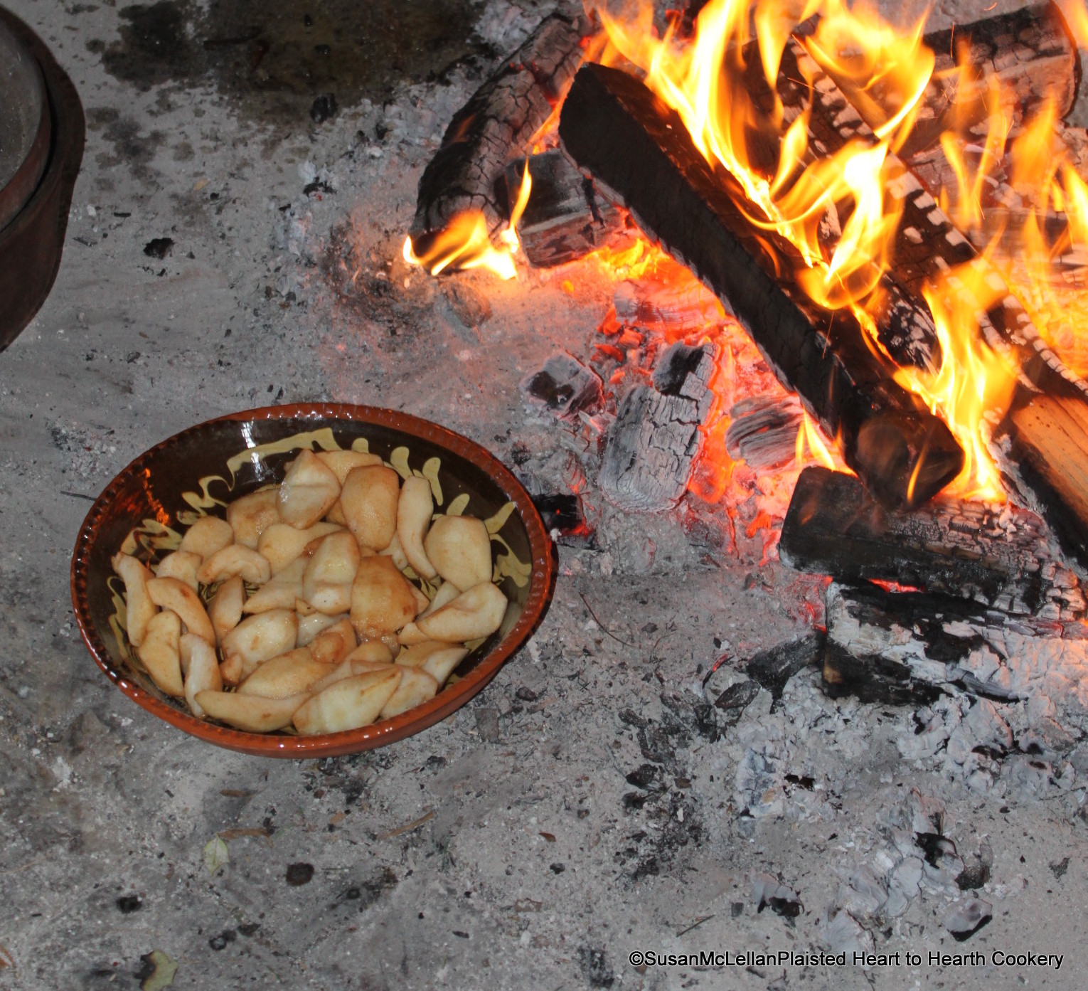 Before the redware baking dish of half a dozen prepared Forelle pears is placed in a bake kettle, the redware is being warmed by the fire to prevent a shock and cracking of the dish. These dozen Pears bak’d will be added as an ingredient to the receipt (recipe) To make a Pear-pudding.