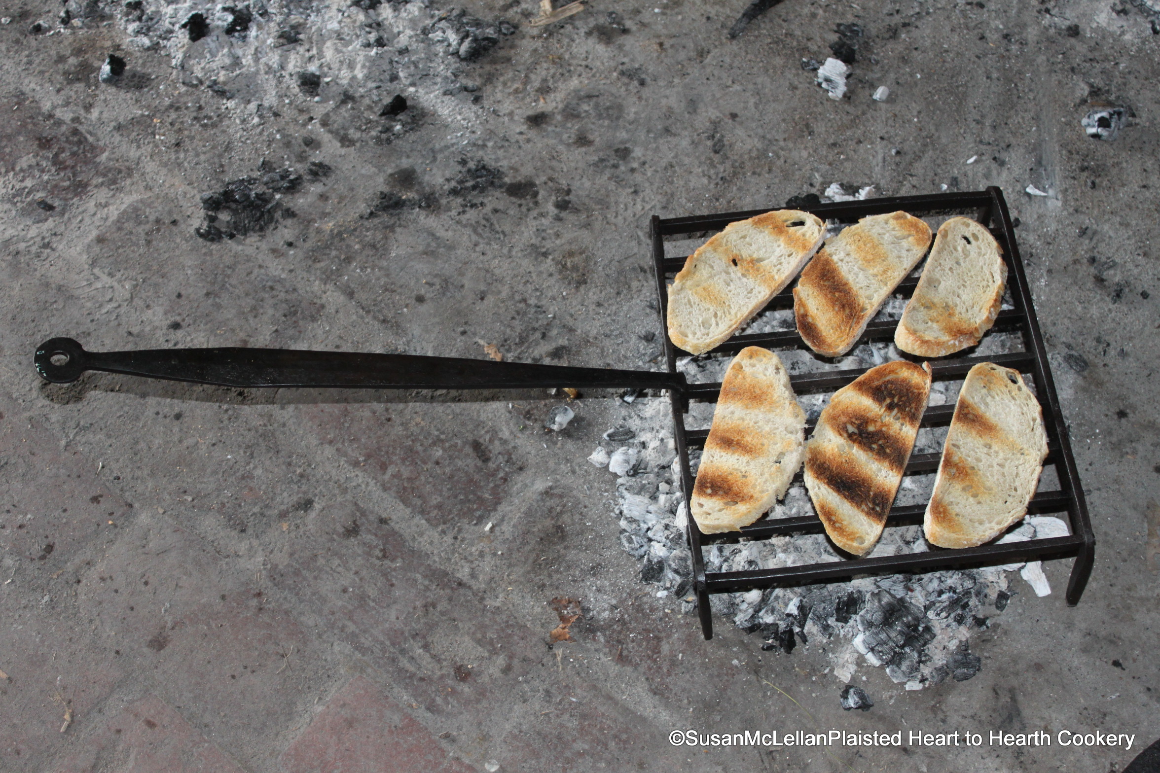 When the fine thin toasts were turned, an interesting pattern appeared on the toasted side from the bars of the gridiron. That a burner of embers heats unevenly is very apparent. The toasts were rotated in position after this picture to toast the other side.