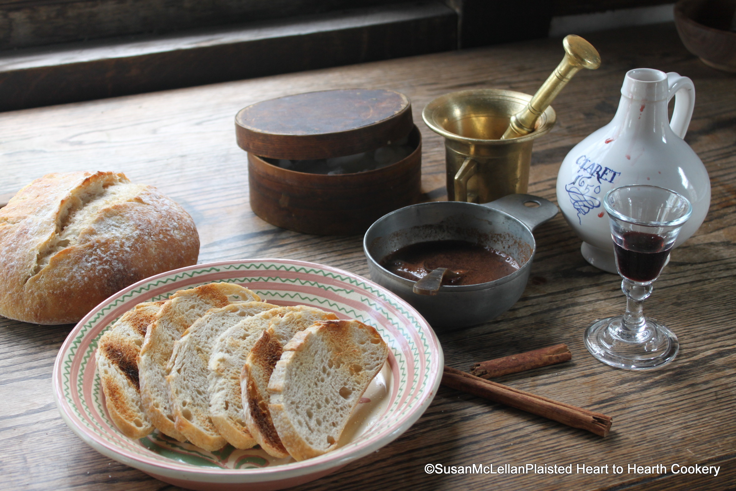 After the thin toasts were removed from the gridiron, the receipt (recipe) for Cinamon Toasts read and lay them in ranks in a dish. I placed them from largest to smallest in the dish and have the mixture of fine beaten cinamon mixed with sugar and some claret ready in the pewter porringer.