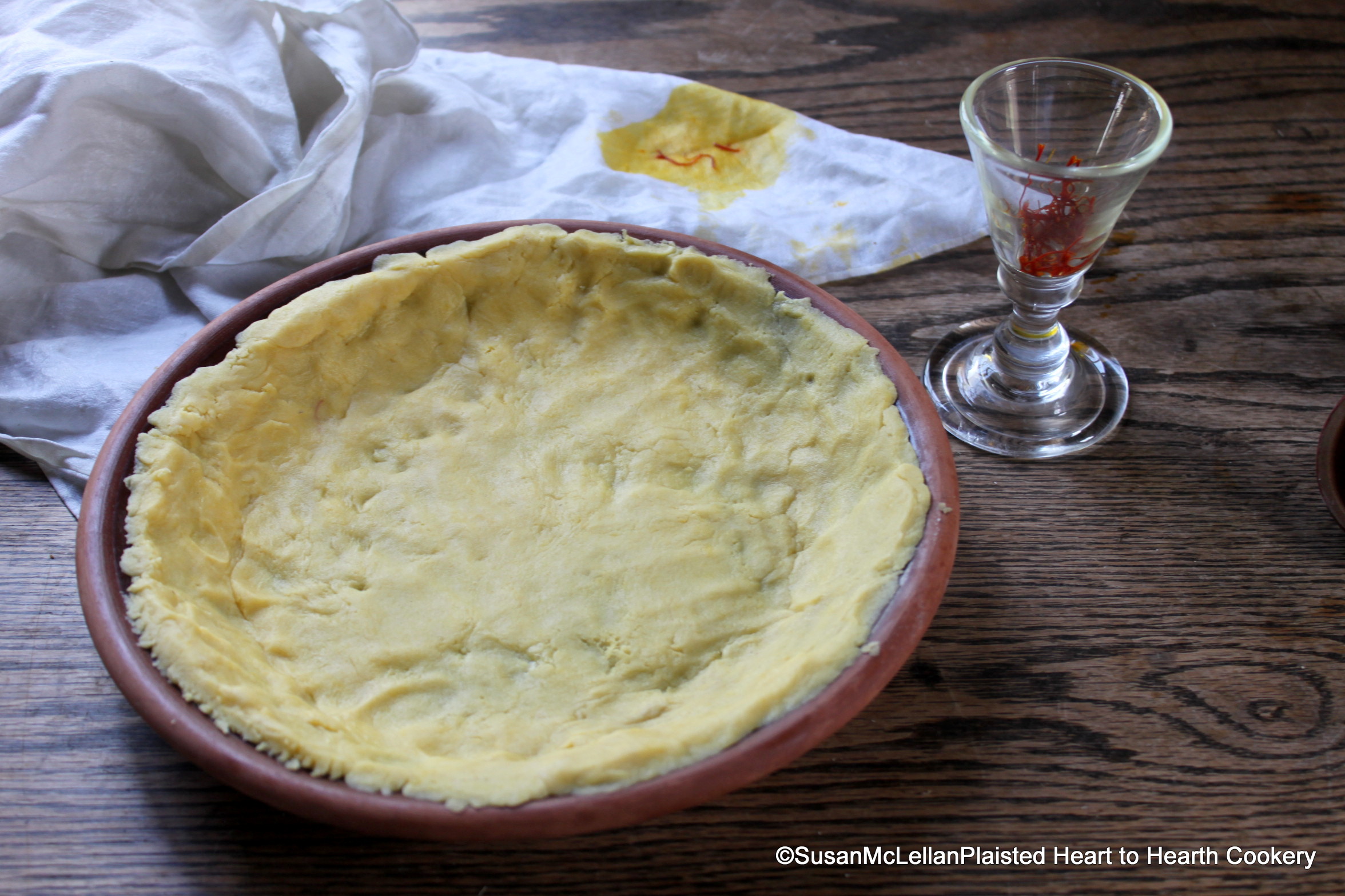 When the saffron paste (pastry) made with egg yolks, sugar, rose-water and water was attempted to be rolled on a lightly floured surface, it was sticky but more flour would reduce the yellow hue. I chose to use my hands to flatten and make the paste fit the baking dish.