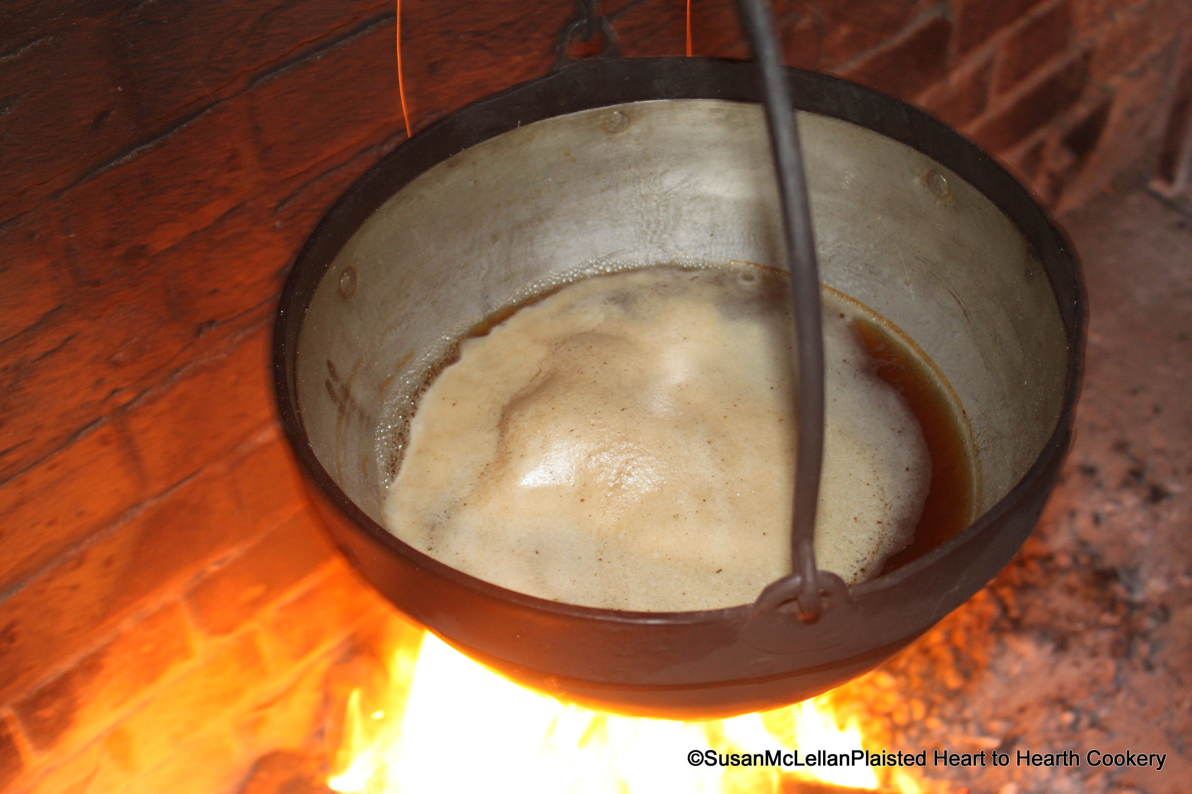 To make a 17th century beverage called Alebury, the receipt (recipe) directs to boil beer or ale. The beer is boiling and producing scum in this reproduction hemispherical kettle.
