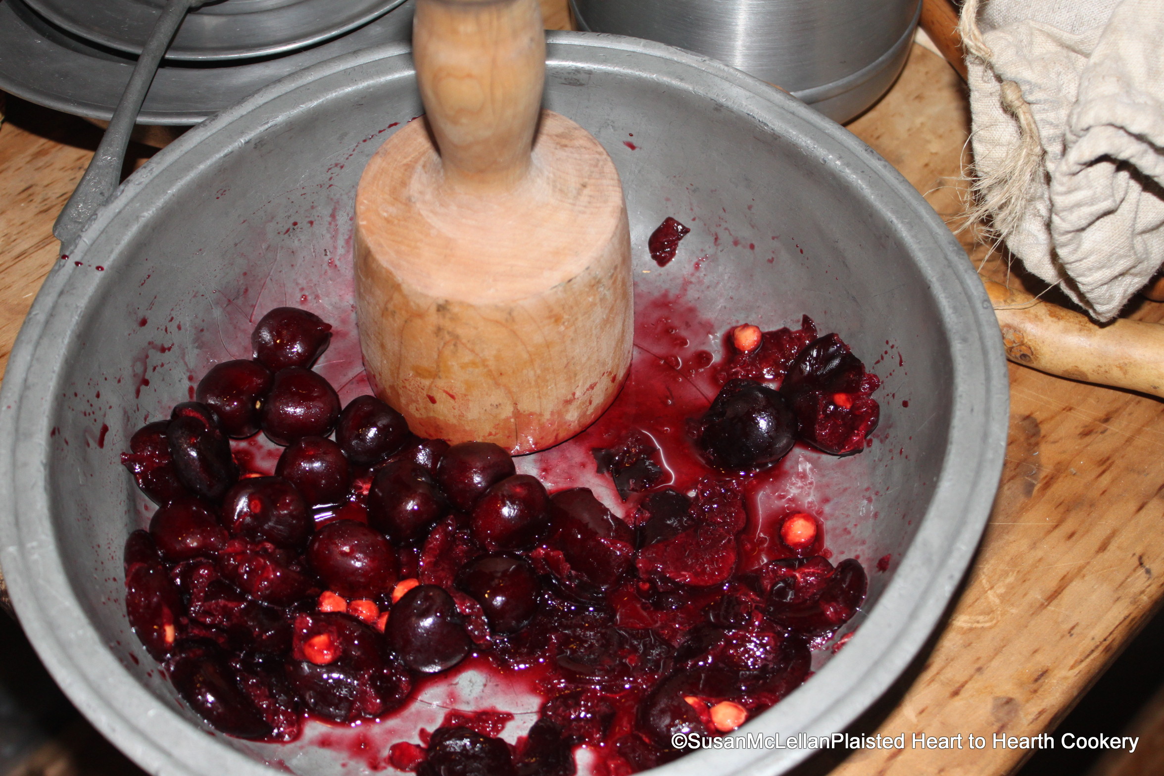 To make the receipt (recipe) Cherry Ice Cream, a half-pound of cherries with stems removed are pounded stones and all. A hand-turned wood masher is being used in a pewter basin.