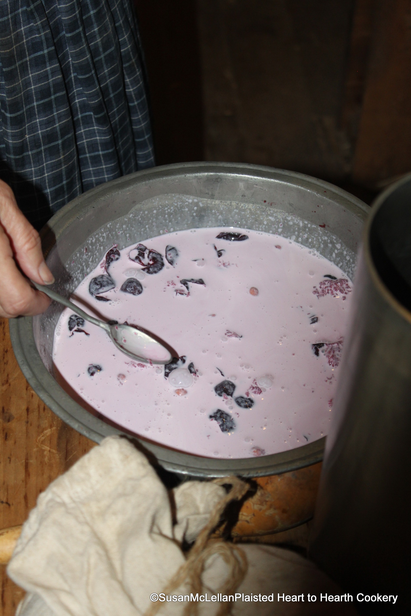 The pounded cherries, stones and all, are mixed with one gill of syrup and a pint of cream for the receipt (recipe) Cherry Ice Cream. A gill cup was used to measure the sugar syrup.