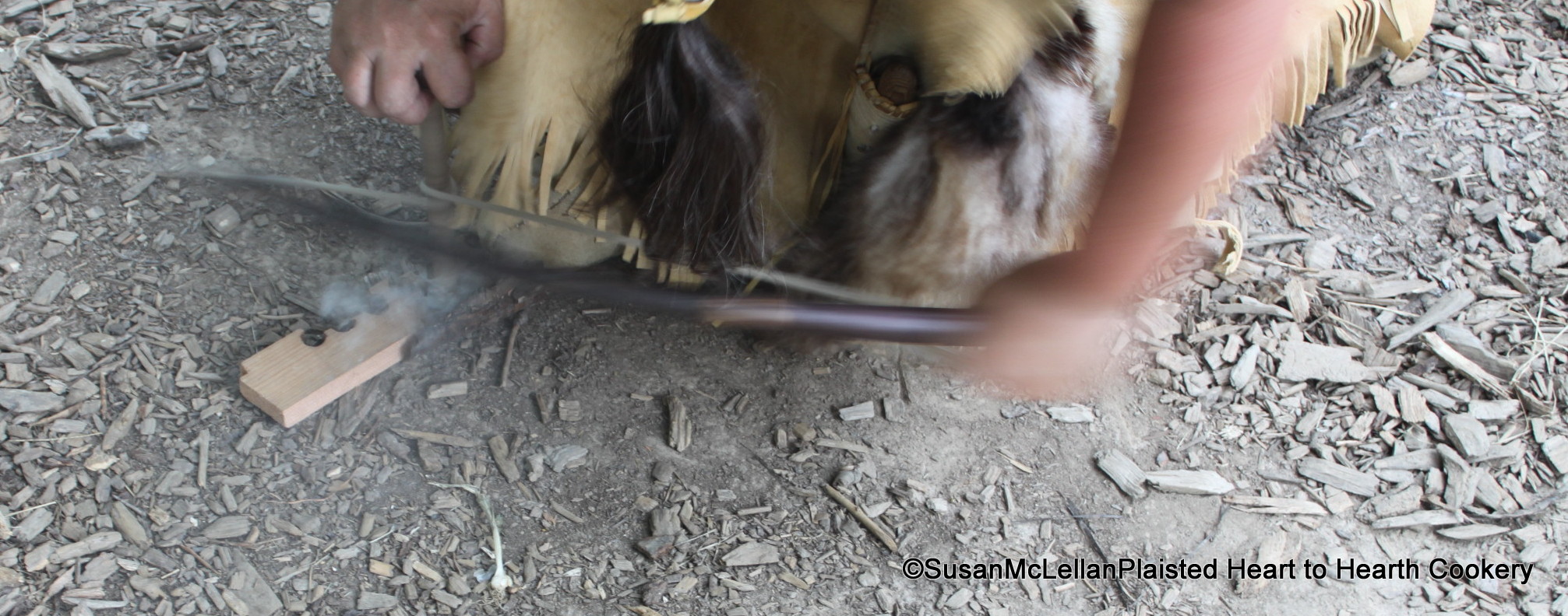 After the cattail pollen was harvested, it was taken to the Lenape Village at Churchville Nature Center for bread. A Lenape instructor provided a fire with her bow drill. The picture shows her vigorously spinning the drill (a straight stick) with a bow (a stick that will bend to add cordage) to make an ember on a notched flat piece of wood that can be held down with the knee. Smoke comes first before the important ember.