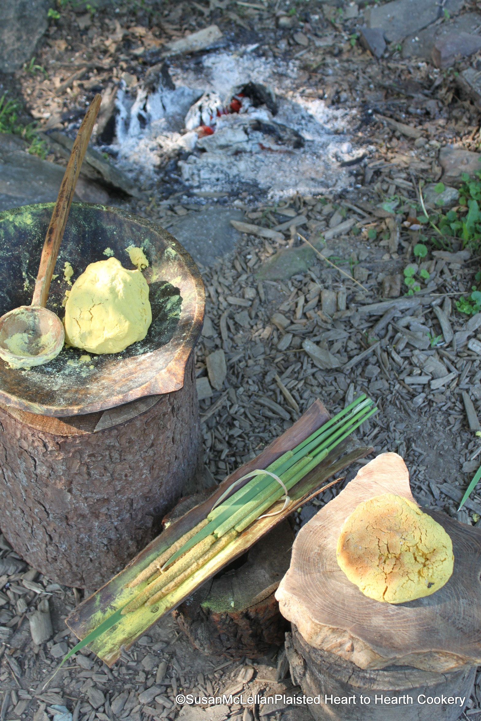 The six inch diameter, one inch thick cattail pollen bread is nicely browned and baked while the well-kneaded dough of Lenape white flour corn hominy ground, cattail pollen collected and water is ready in the wood bowl to be formed into another bread for baking.