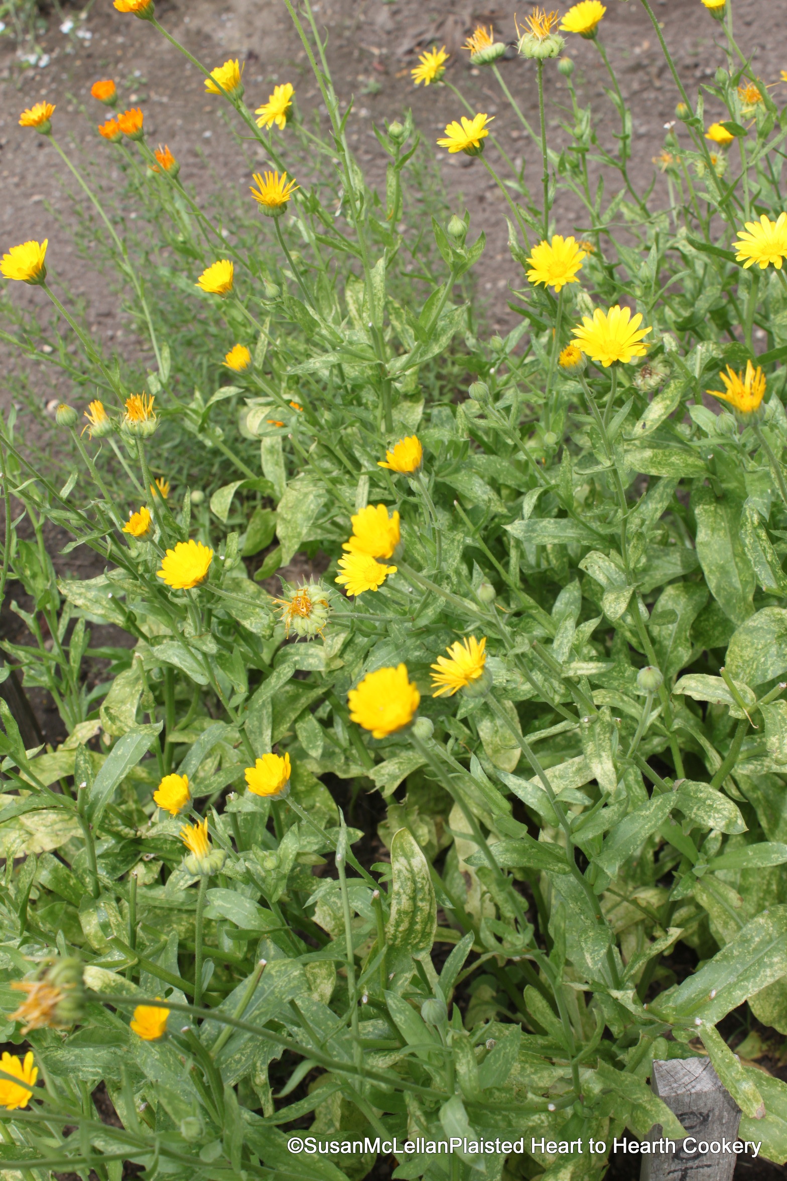 The flowers of Calendula officienalis (pot marigold) have both a history of culinary and medicinal uses. In A Niewe Herball, 1578, Dodoens-Lyte writes: It hathe pleasant, bright and shining yellow flowers, the which do close at the setting downe of the sunne, and do spread andopen againe at the sunne rising.