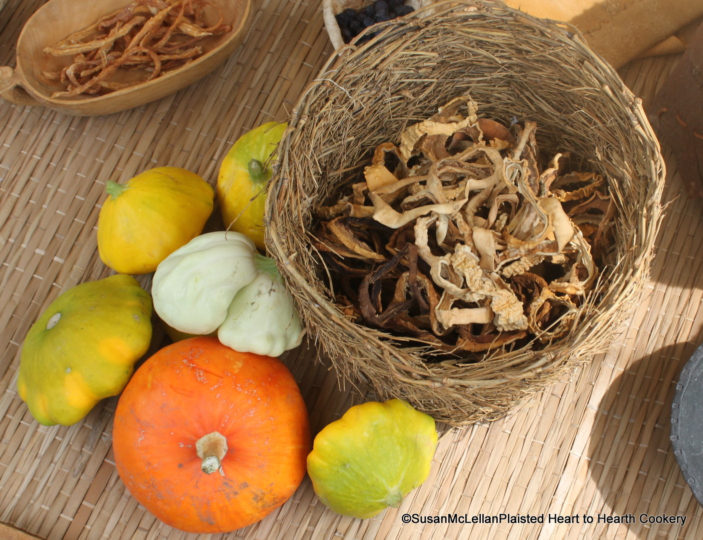 IMG_0007-002  There were many varieties of Cucurbitaceae (squashes, pumpkin) that were grown by the Lenape.  Late summer and fall, the small new squash were harvested.  The grass basket contains the harvested squash preserved by drying.  The European word for the scalloped squash in the 17th century was symnel.