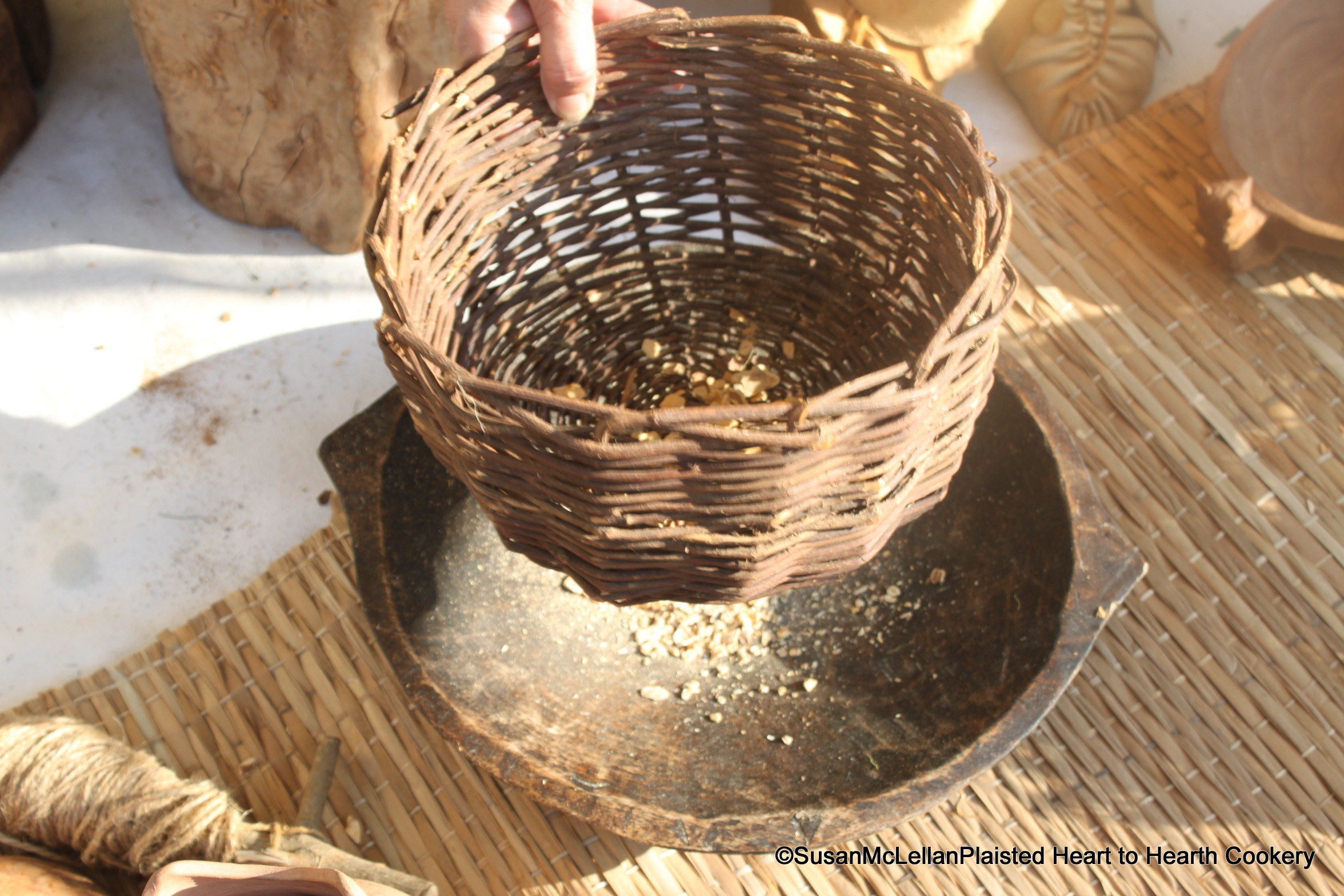 Only the finest of the particles of the pounded dried squash sift through the grape vine basket into the wood bowl for preparing a dried squash cake.