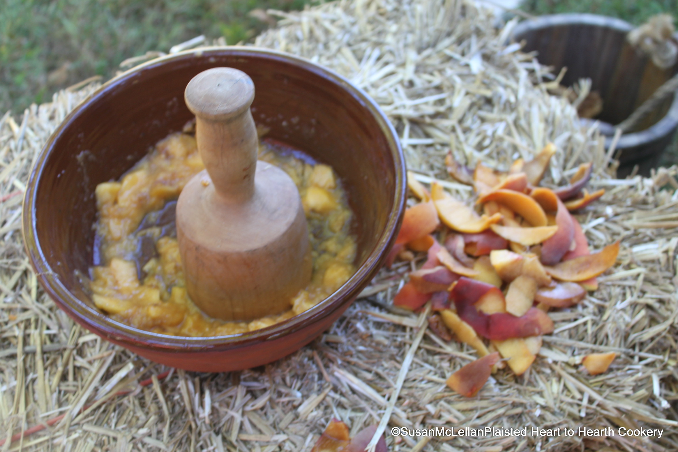 To make Fresh Peach Ice Cream, Take 4 ounces of the ripest peaches you can get. These peaches were peeled and mashed by children with a wood masher.