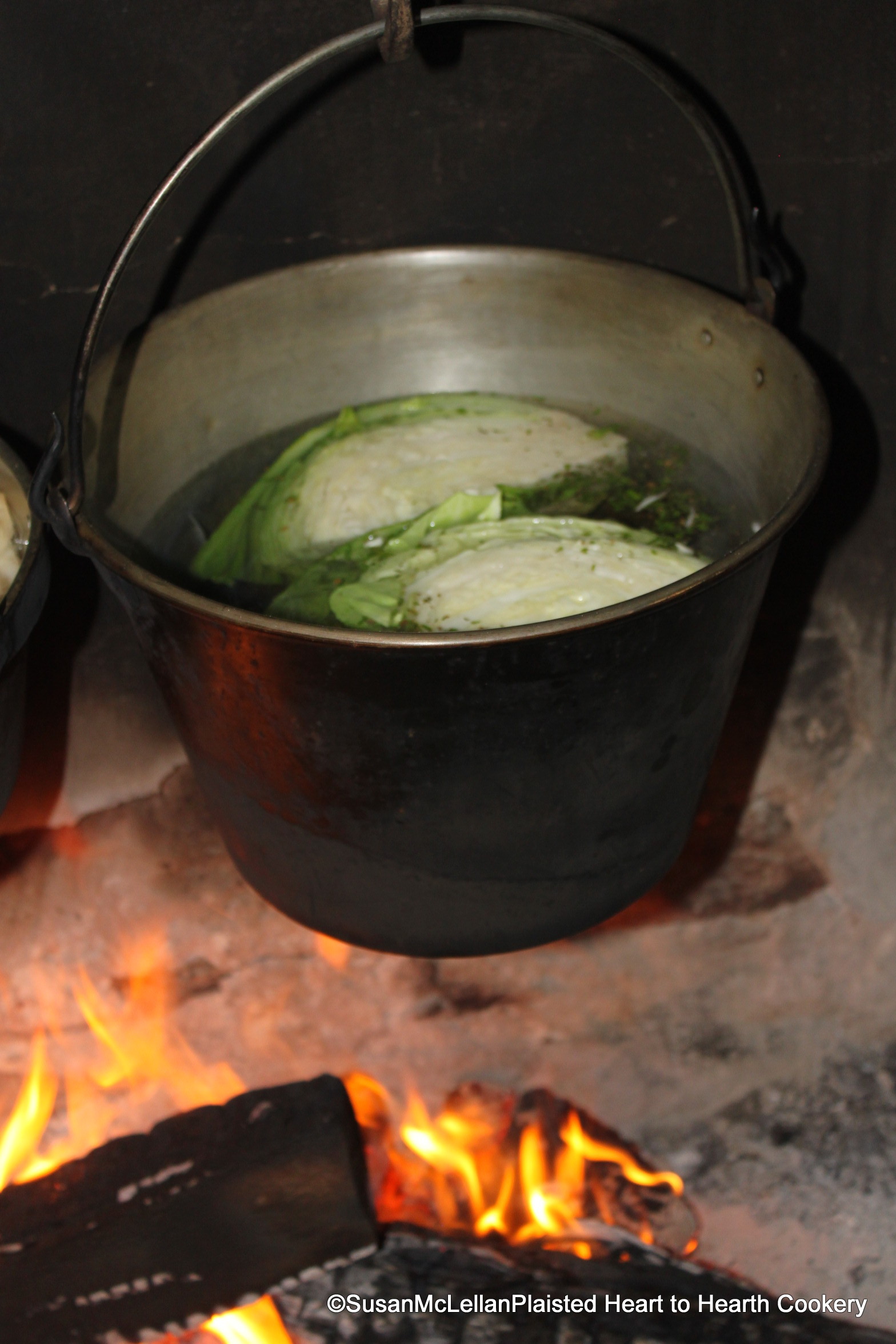 For the receipt (recipe) for Cabbage Soup, first take some Cabbage, cut it in Quarters, or less, and boil them down pretty tender. You can see two of the cabbage quarters in the kettle over the fire.