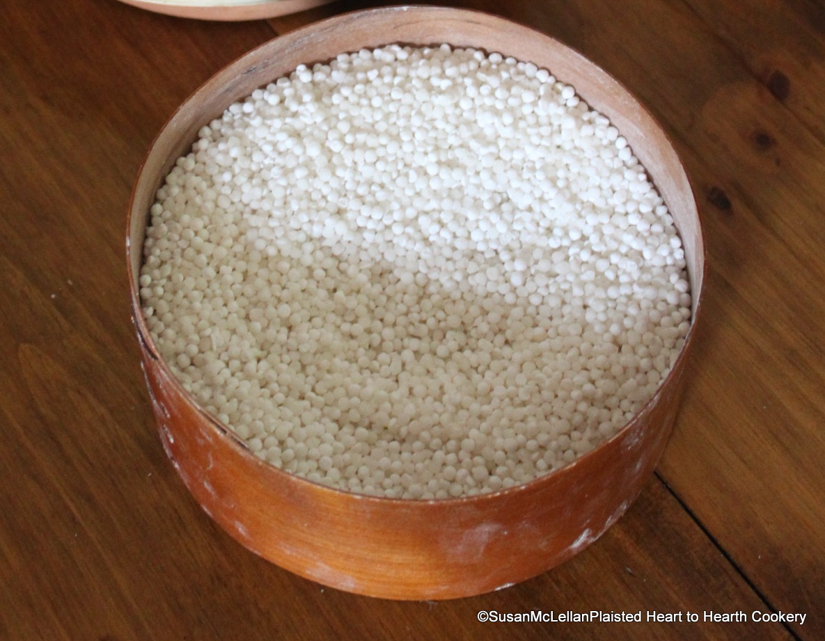 Sago or palm starch comes from the pith of stems of palms and has its origin in Southeast Asia. The palm tree is harvested when a flower spike appears, as the development of the flower will deplete the stored starch as it is used by the flower. When the starchy pith is extracted locally it is grated to make a powder and processed into sago meal. For exportation, the sago meal has water added to make a paste and sieves are used to make pearls which typically are used for puddings.