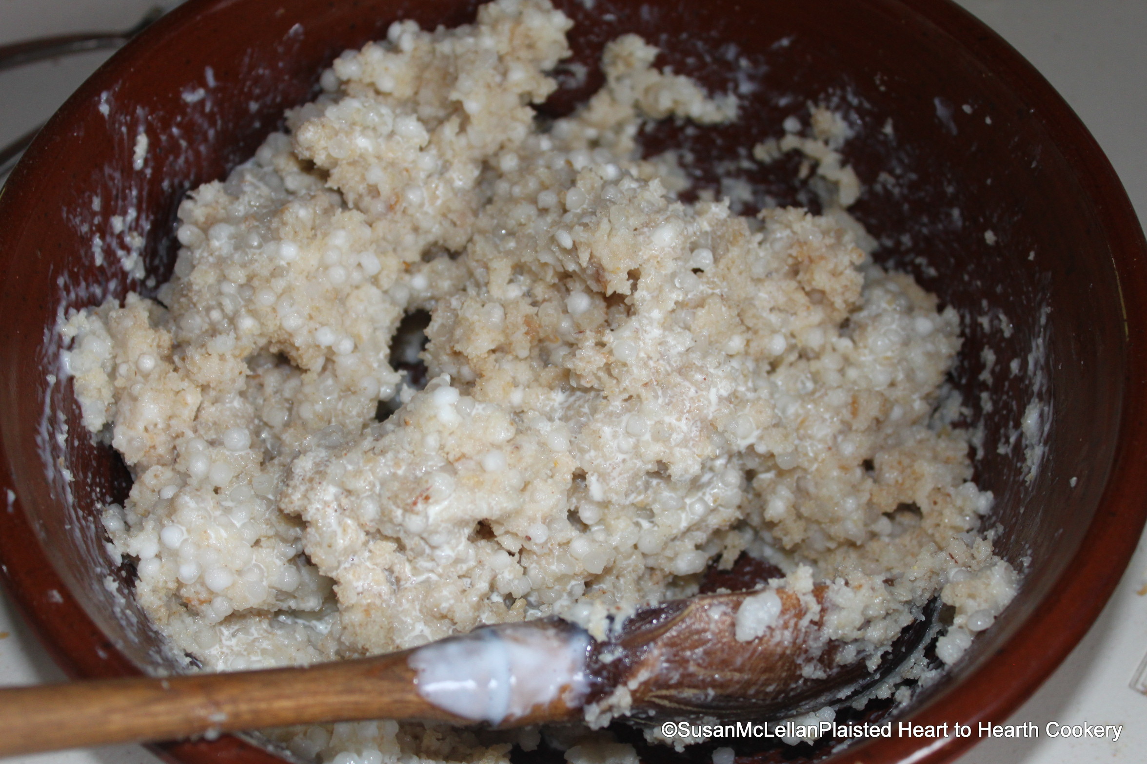 After the sagoe has been boiled thick in milk and water, the receipt (recipe) for Sagoe Pudding directs to put to it half a Pound of Bisket grated, or Bread, and season with Sack, Sugar, Orange Flower, or Rose Water, Salt, Cinnamon, Ginger, and Nutmeg; put in some Citron slic’d, and if too thick, put in a little Cream: work it well together. Orange flower water was selected for this pudding.