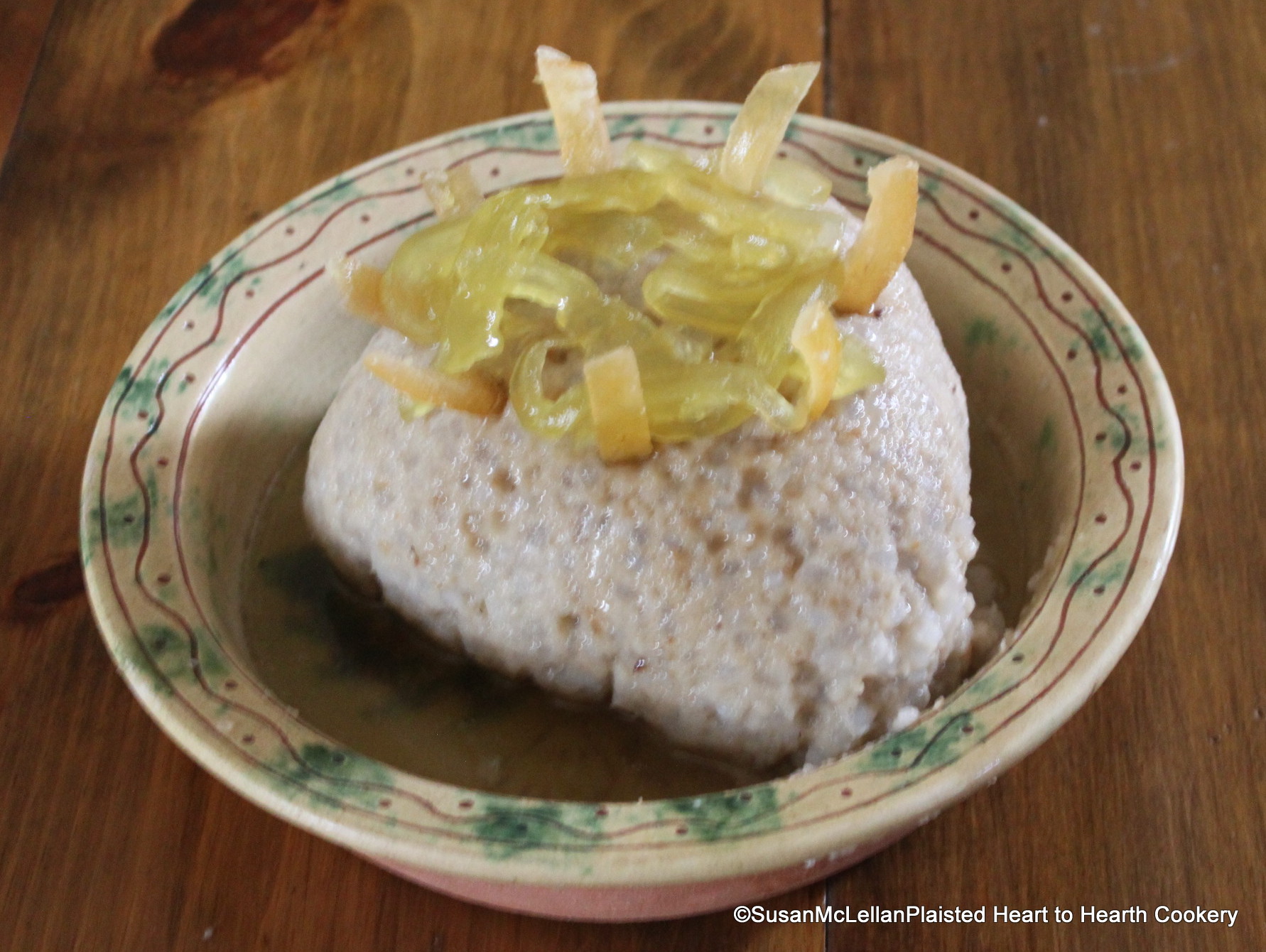 The Sagoe Pudding prepared with sago, milk, grated bread, sack sugar orange flower water, salt, cinnamon, ginger, nutmeg and sliced citron was sauced with butter, sack and sugar and stuck with some citron and candied orange for a glorious presentation on the table.