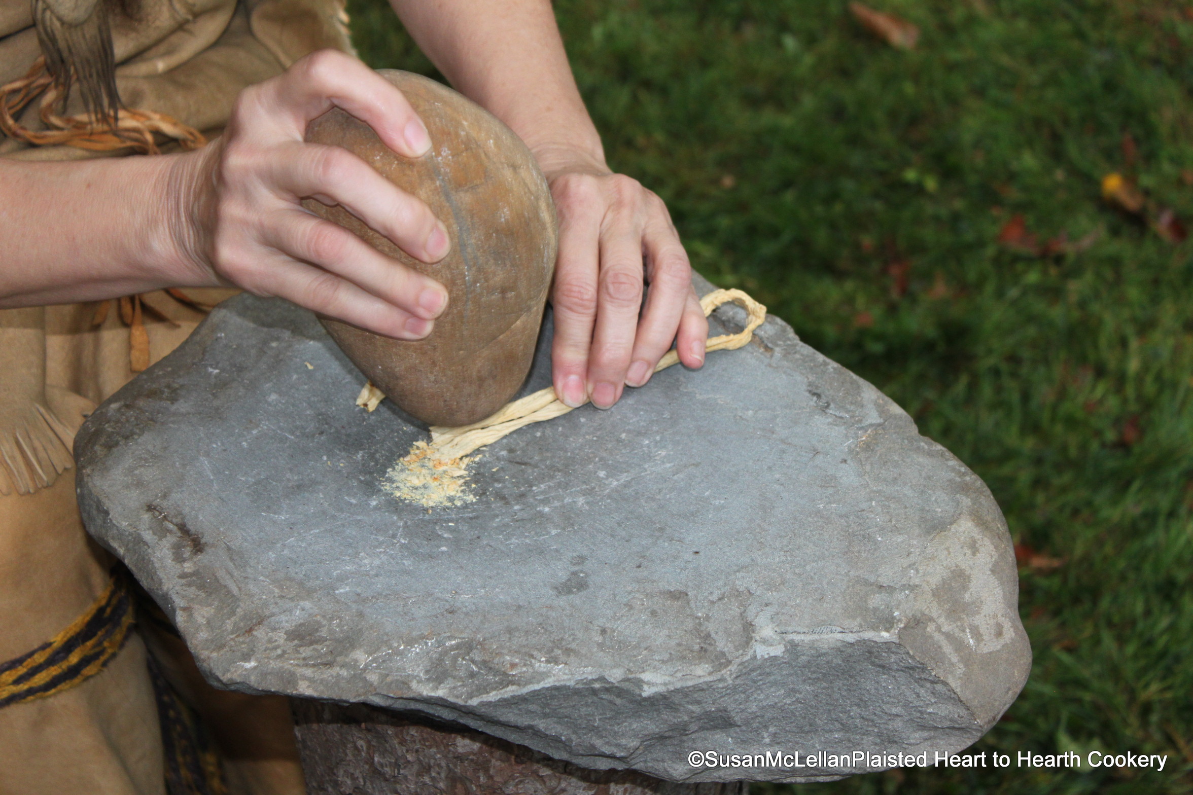 The turkey dried on the drying rack is being pounded fine to add with the dried squash for the Lenape daily fare.