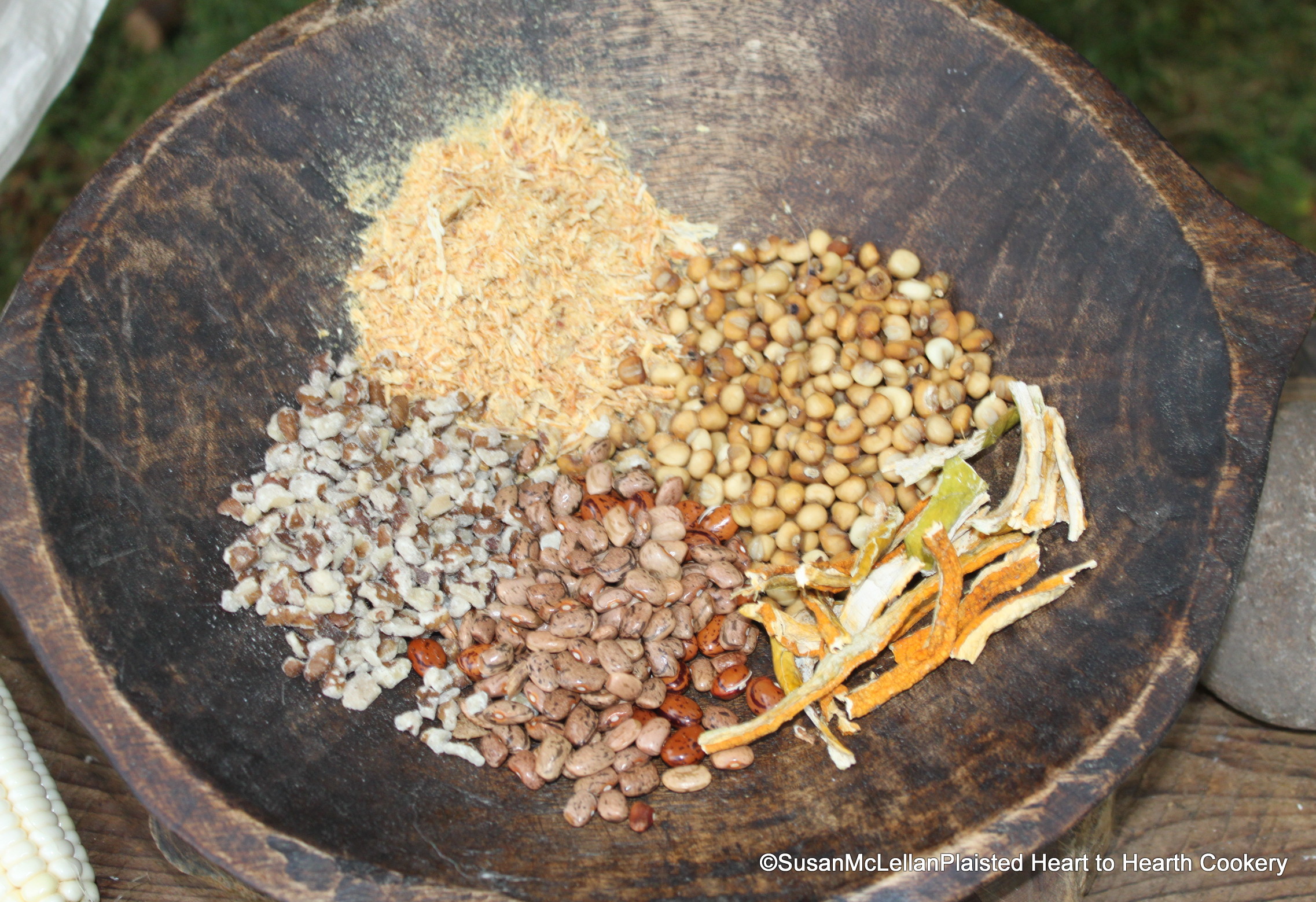 In addition to the dried squash, and dried turkey pounded, the other ingredients for the Lenape pottage (pictured in the bowl) are hickory nuts, Munsi wolf beans, and Lenape white flour maize (corn) processed into hominy with the nixtamalization process.