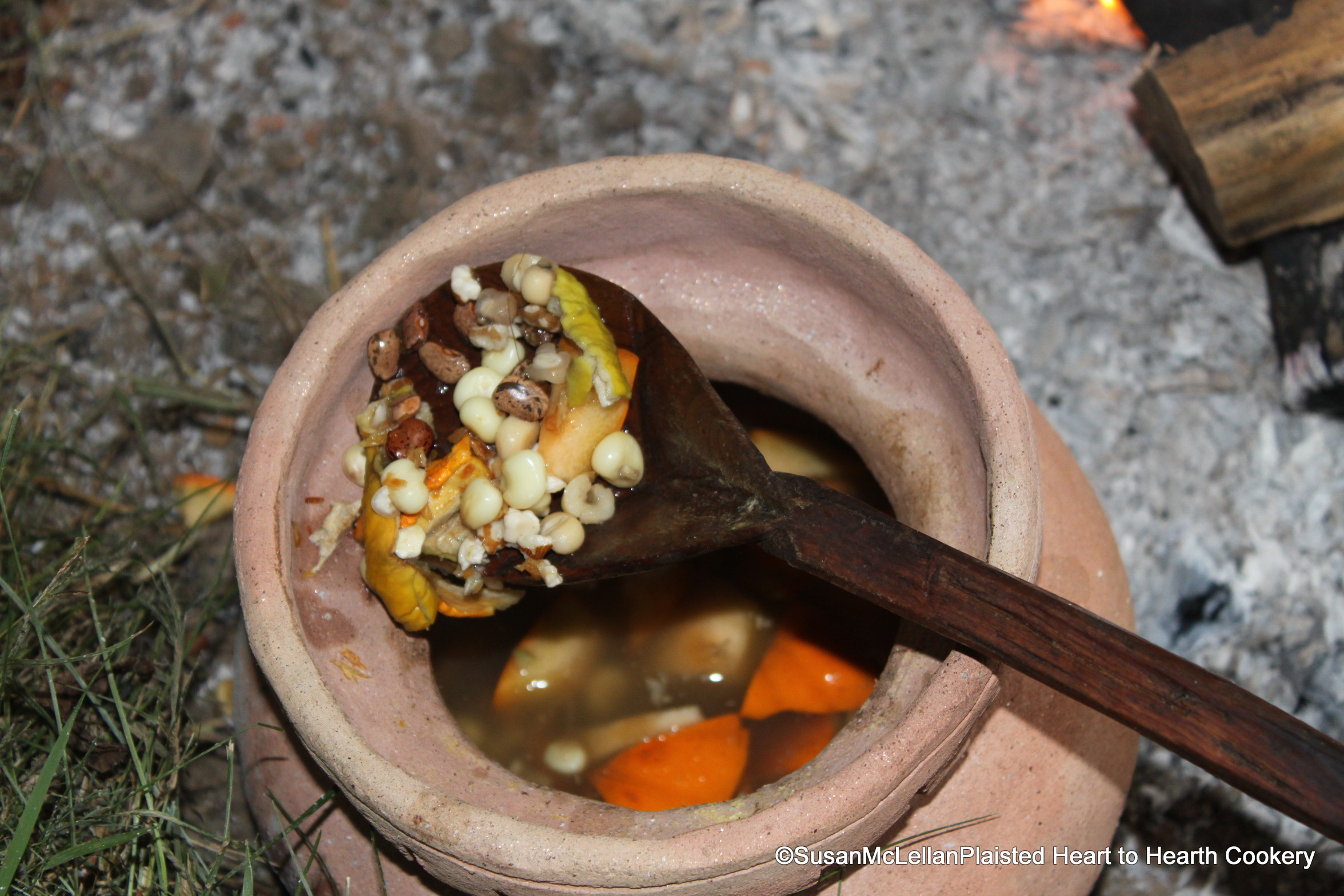 This Lenape pottage consisted of dried squash, dried turkey pounded, hickory nuts, Munsi wolf beans and Lenape white flour maize (corn) processed into hominy with the nixtamalization process. In addition, since the new fresh squash were still being harvested, some fresh squash was added too.
