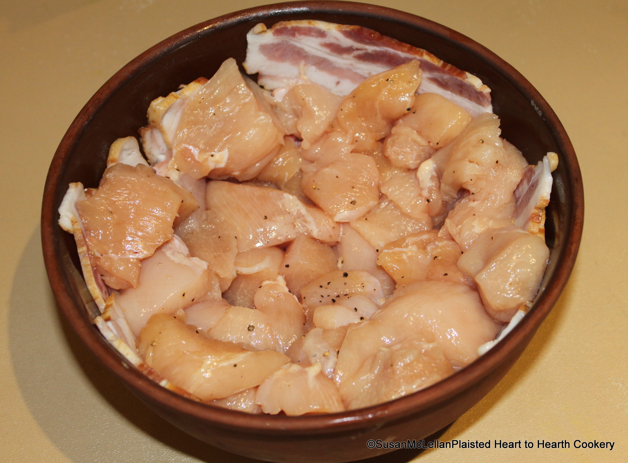 This pudding-dish is lined with slices of bacon and then cut chicken, seasoned well with pepper and salt, are laid into the dish for the Sara Josepha Hale receipt (recipe) Chicken Baked in Rice