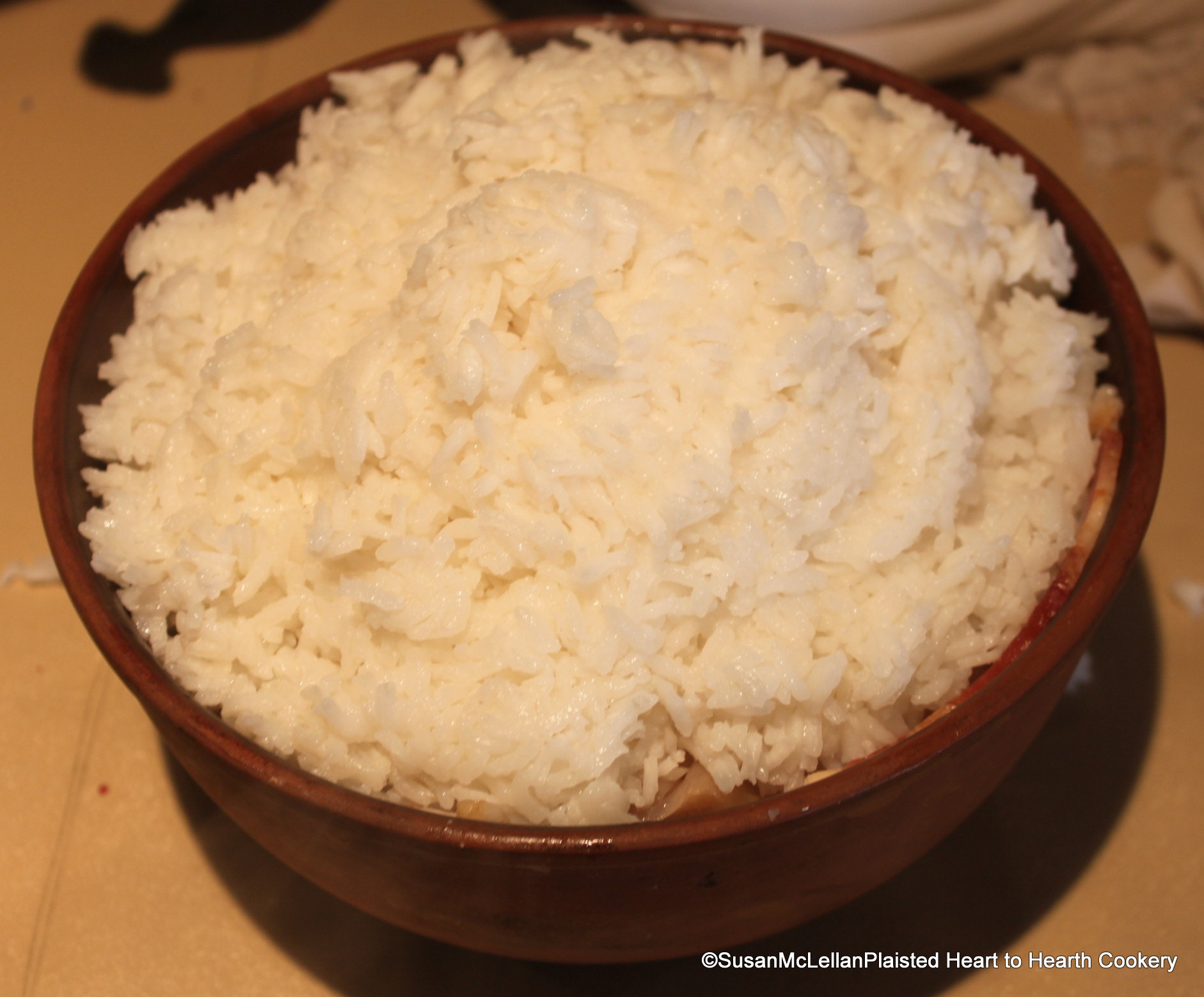 The receipt (recipe) for Chicken Baked in Rice directs that the pudding-dish lined with slices of bacon and cut-up chicken, onions and minced onion be filled up with boiled rice well pressed and piled as high as the dish will hold.