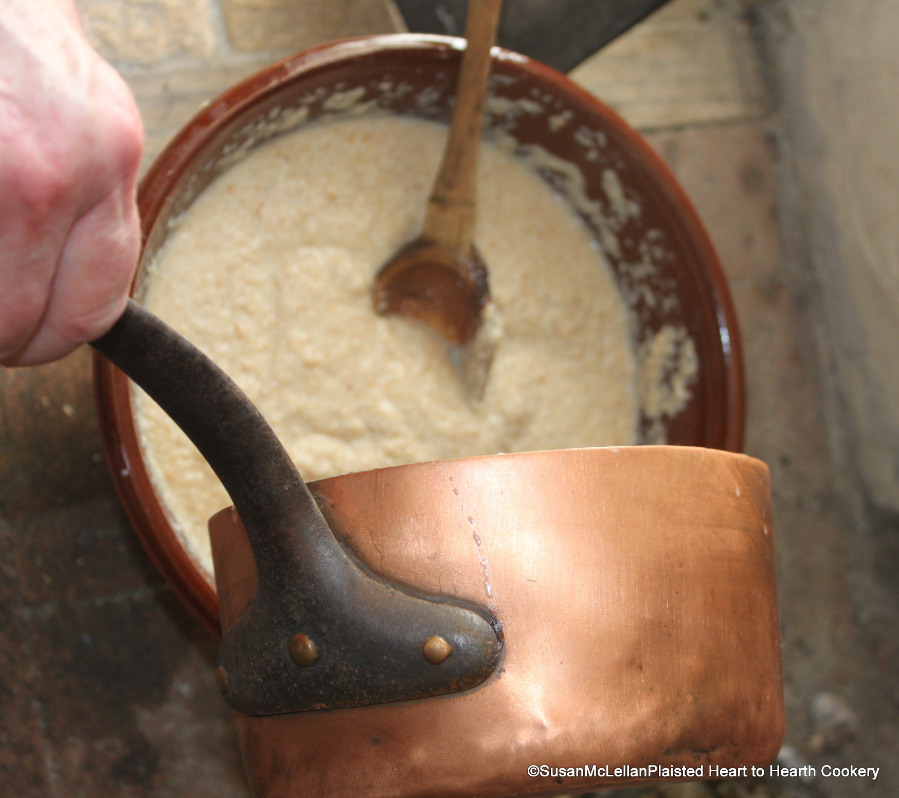 A pint of new milk with three ounces of fine sugar and a few grains of salt were boiled in the copper sauce pan to start the preparation of Sarah Josepha Hale’s receipt (recipe), Bread Pudding. The hot mixture is being poured on half a pound of fine and lightly-grated bread-crumbs.