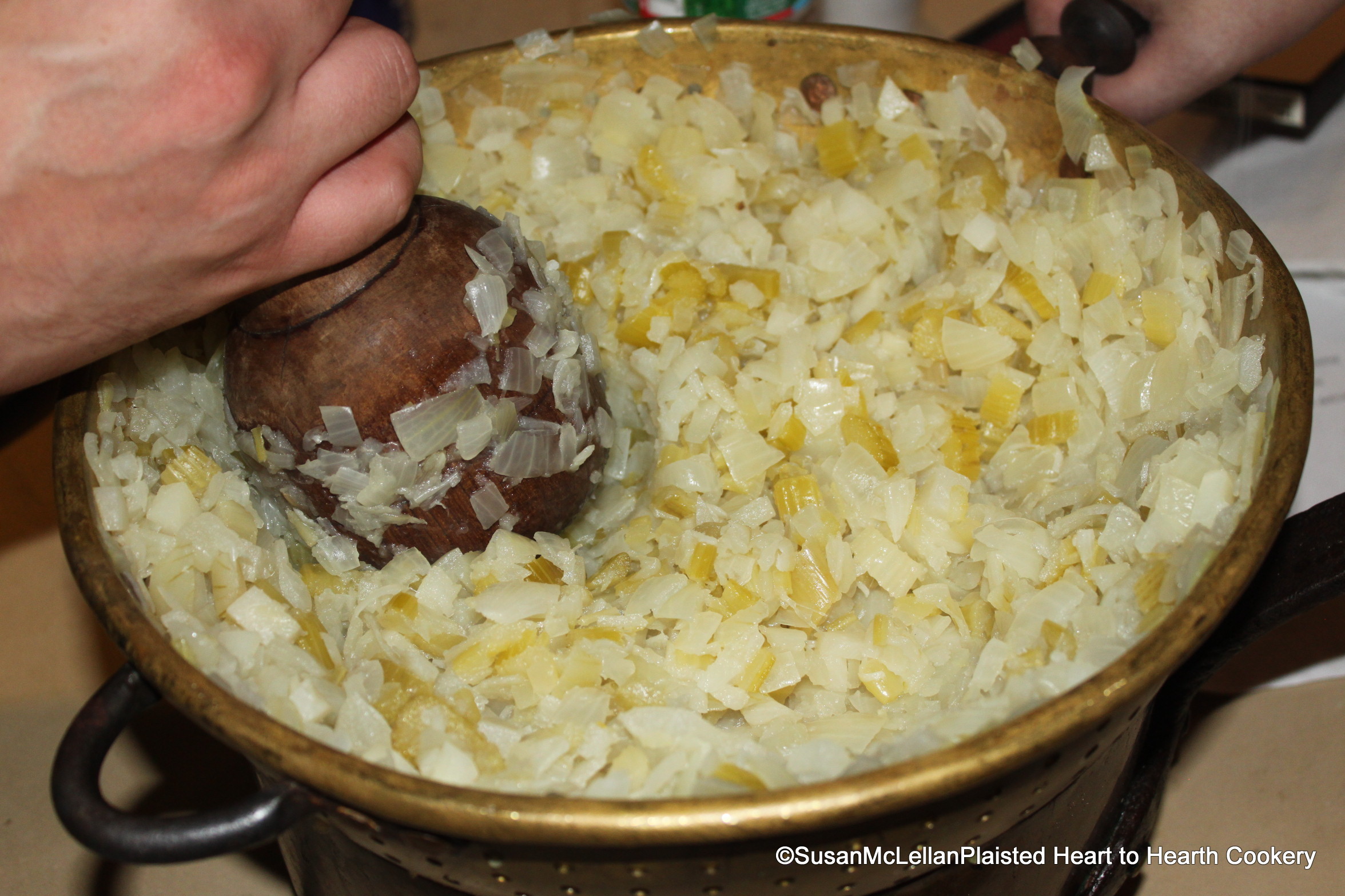 For the receipt (recipe), Rich Onion Soup, after the onions, turnip and head of celery were stewed until tender; the next step was to pulp the vegetables which was done with a wood masher in a brass colander.