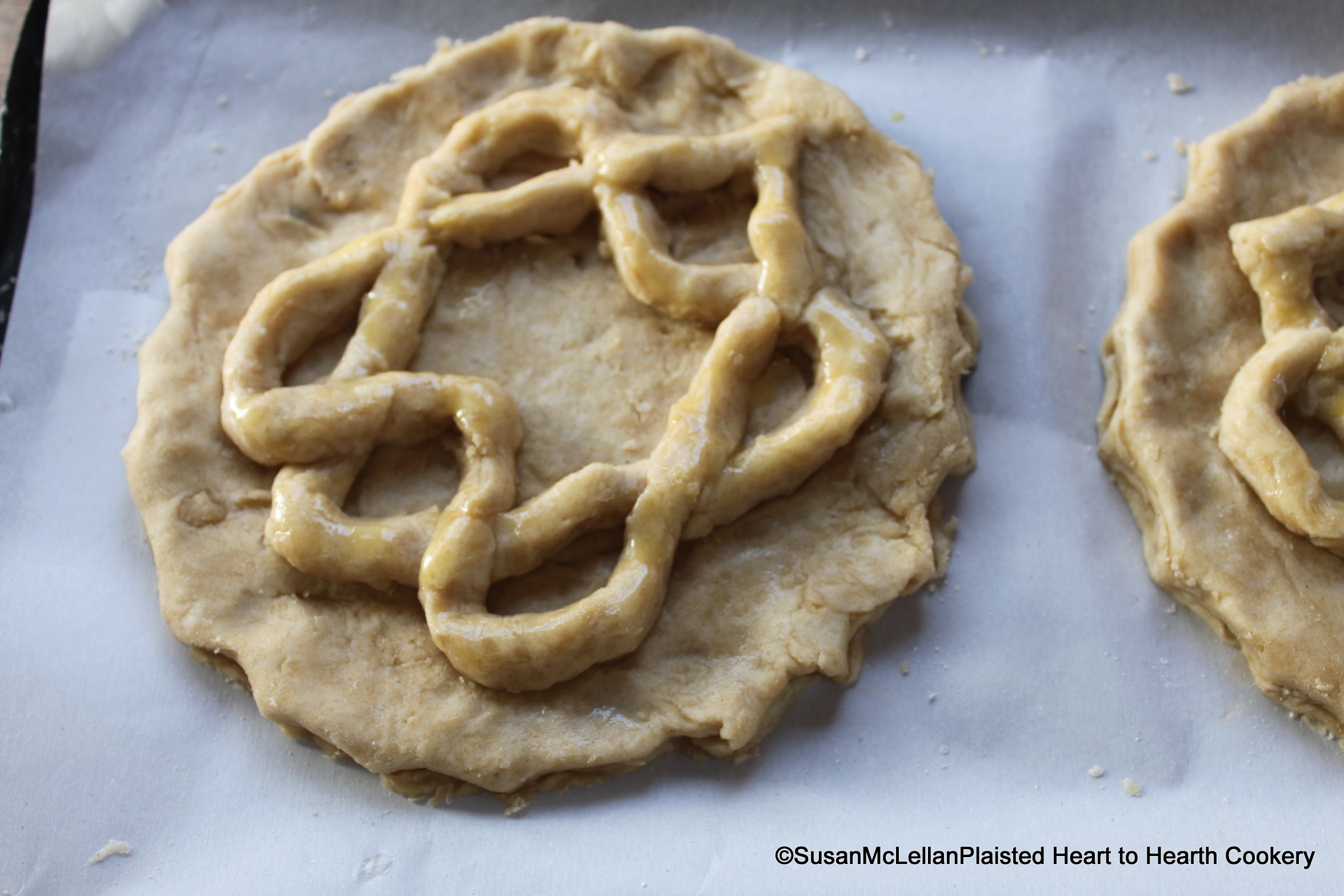 An yolk egg wash is used to high light the design on the cut laid tart lid prior to baking in the bake oven.