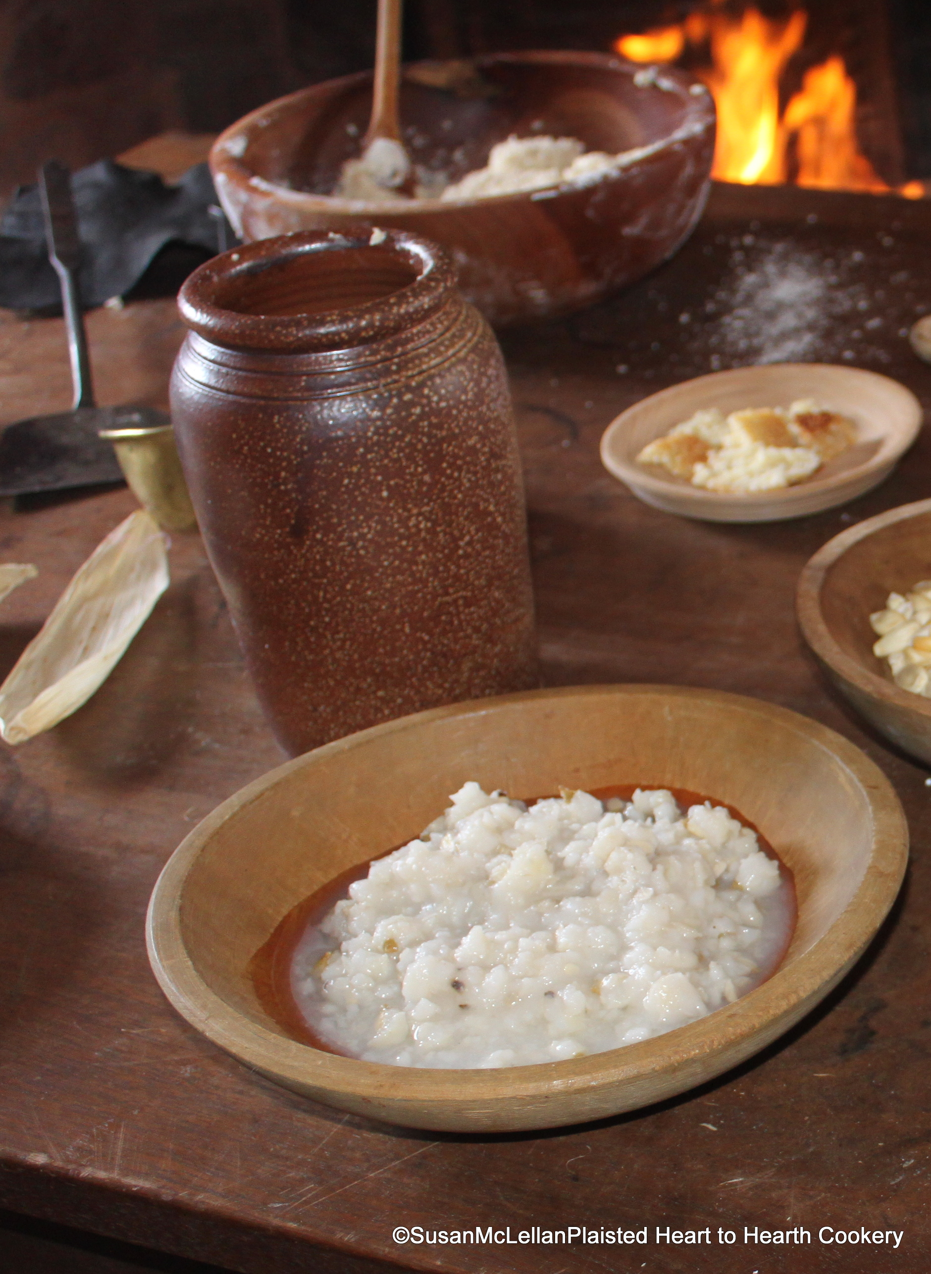 After the corn had soaked in the lye and each grain cracked, there were several rinsings required in clear water to release hulls and remove lye residue. The lyed corn is then cooked with a little salt and a lot of water for three to four hours in a pot. “It is a very nice dish served up hot out of the boiling kettle taken with butter or eaten with milk like mush.” But it was advised to store most of the cooked hominy in a stone vessel to fry or bake later.