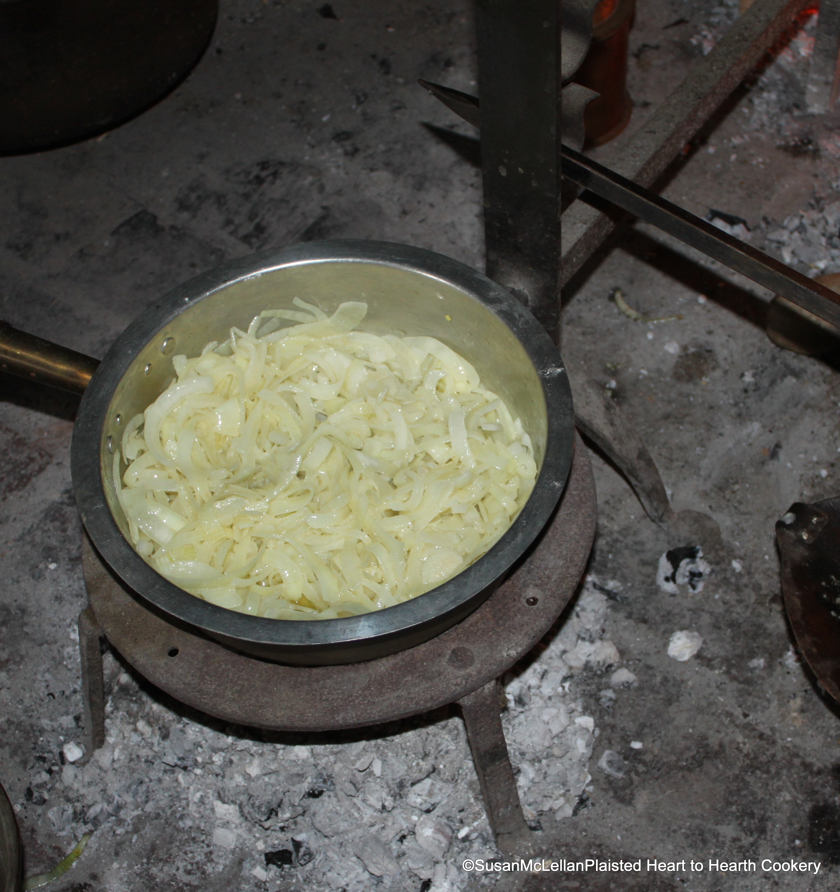 For Robert May’s receipt (recicpe), Onion Pottage, the first step is to fry good store of slic’t onions. The onions are being fried in butter in my reproduction tin-lined Dutch skillet on a trivet.