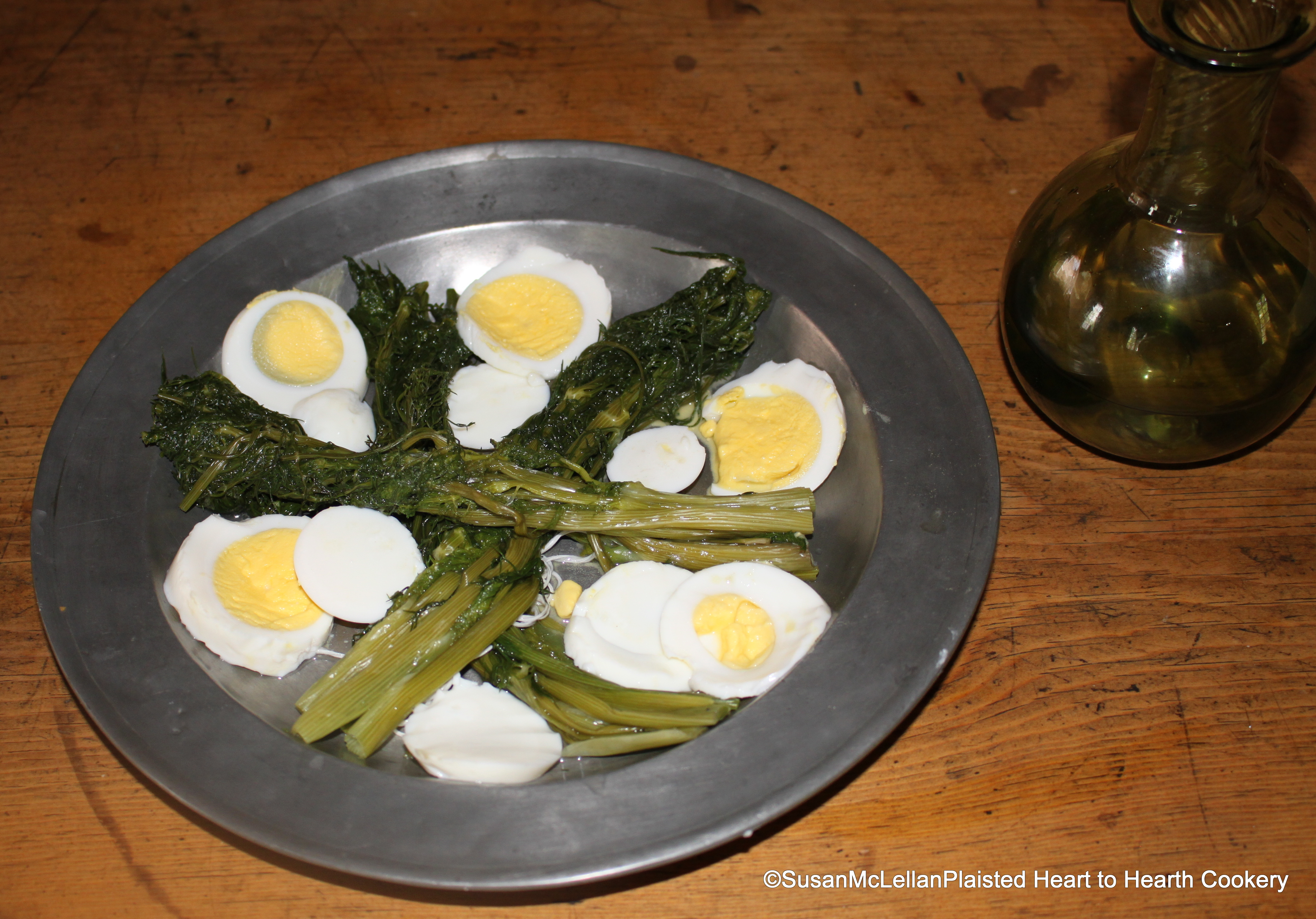 After the young Fennel is drained and bundles untied, the receipt (recipe) for A Sallet of Fennel directs to dish it up as you do Sparragrass (asparagus), pour on Butter and Vinegar, and send it up. Thus the plate is garnished with slices of the hard boiled spring egg.