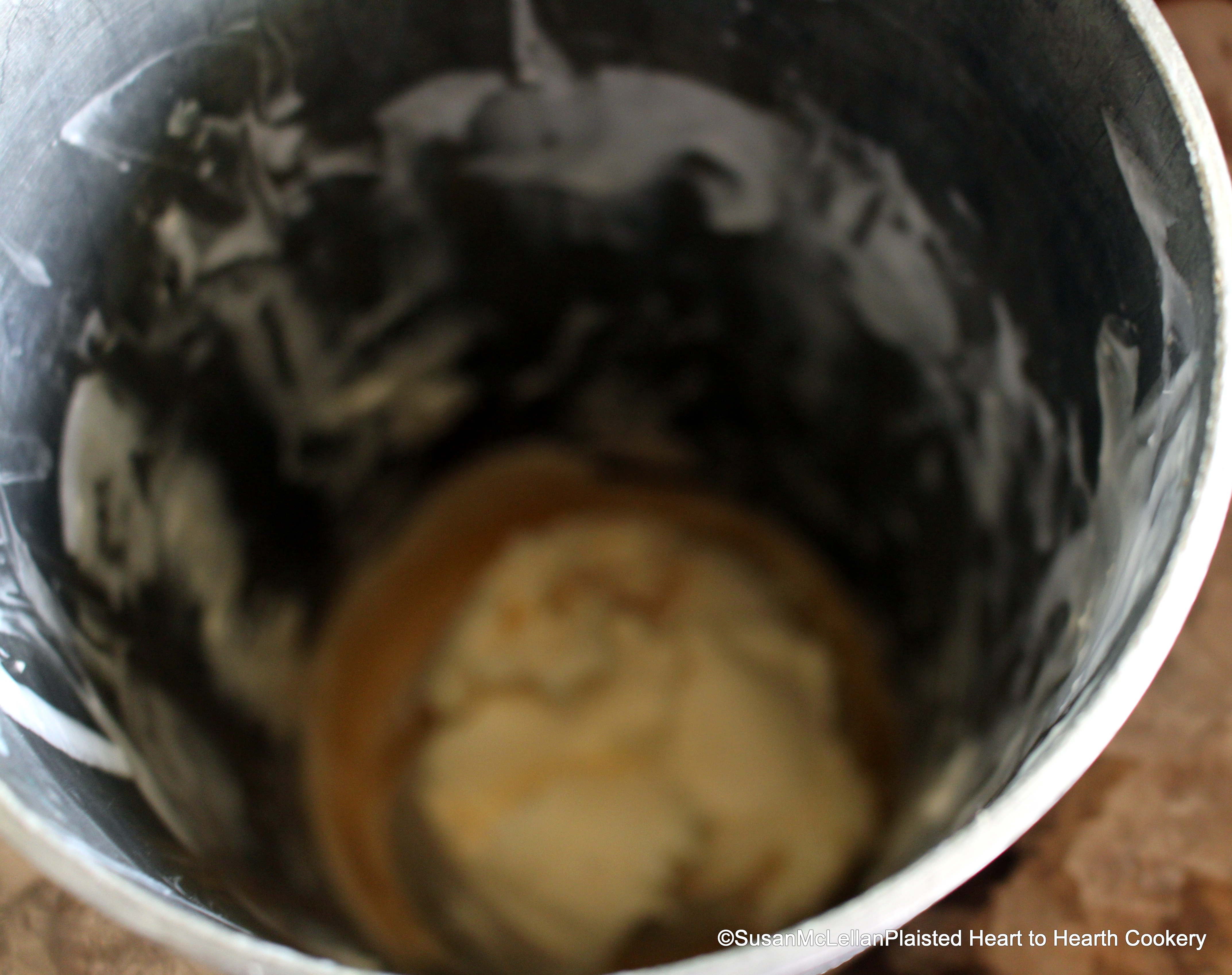 The receipt (recipe) for Fresh Apricot Ice Cream (what is left of it as I forgot to take the picture before giving out samples). The ingredients are the ripest apricots you can get, powdered sugar and cream.