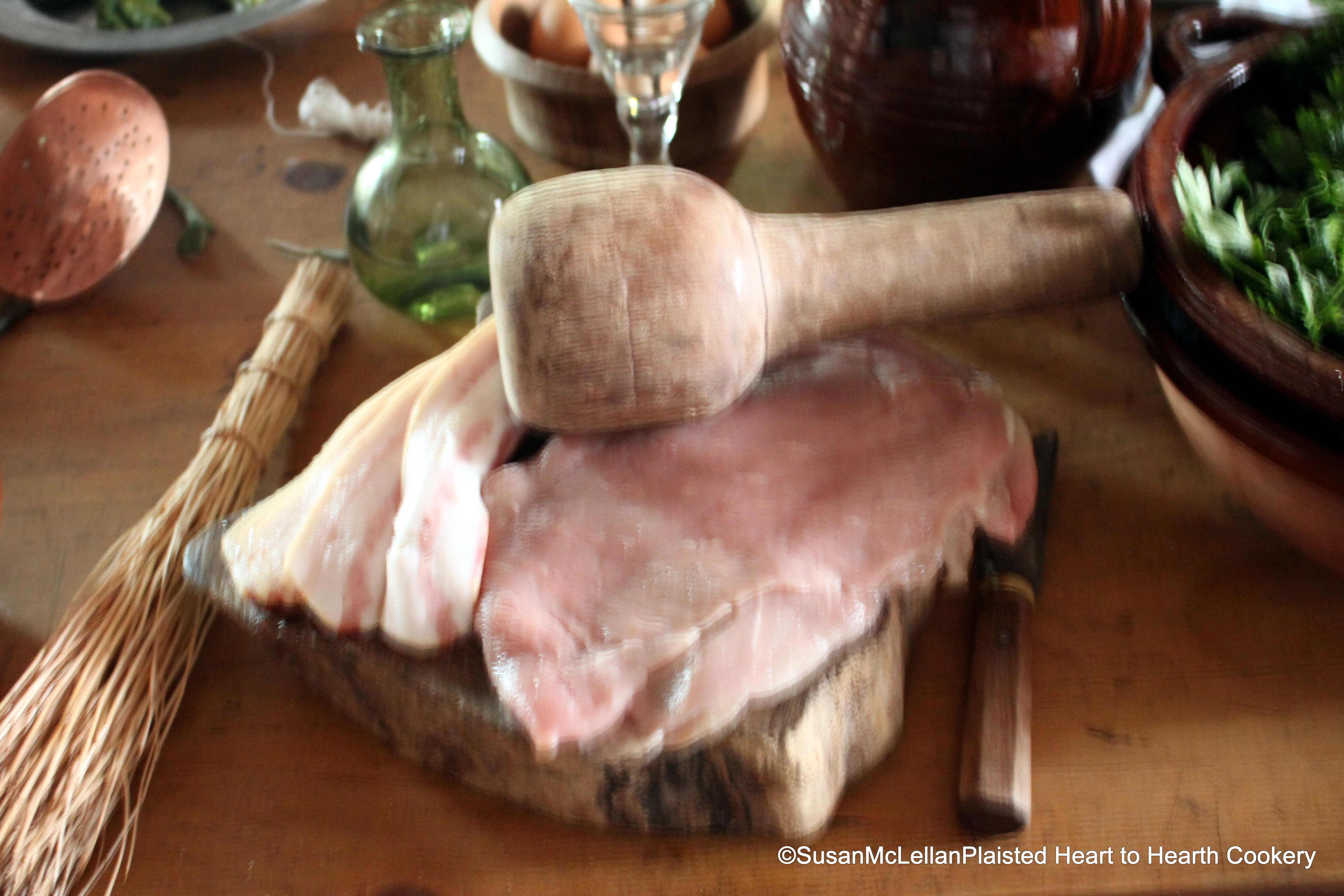 The first step for the receipt (recipe), To Boyl a Breast of Veal, is to Bone your Breast of Veal, and beat it well. On my board is a piece of the veal breast that I have been pounding and some middle bacon also needed for the receipt.