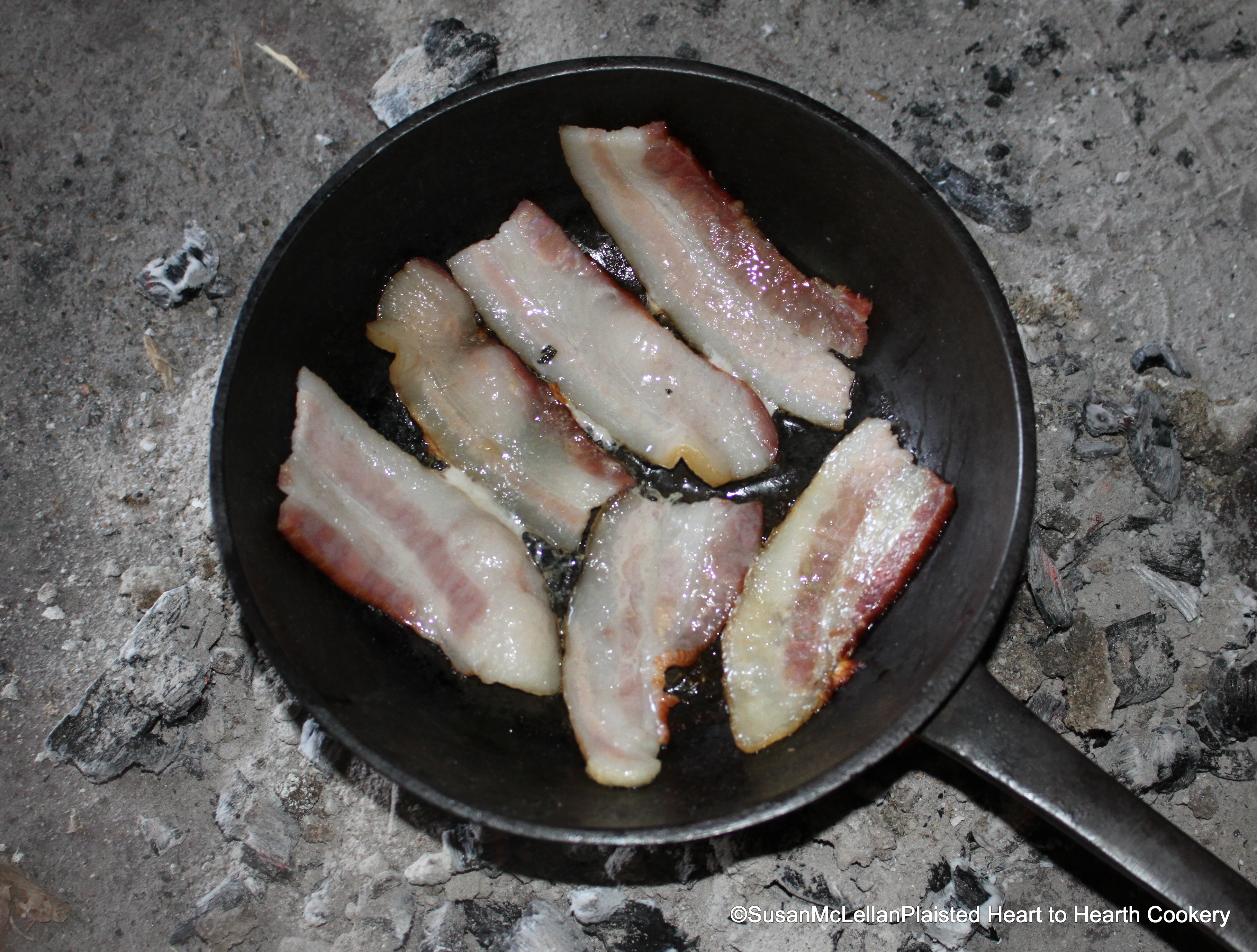 After the collered veal has been sliced in eight slices for the receipt (recipe), To boyl a Breast of Veal, the Bacon is sliced in the same number. After slicing the bacon that had boiled with the rolled veal, I finished it off in a cast iron skillet.
