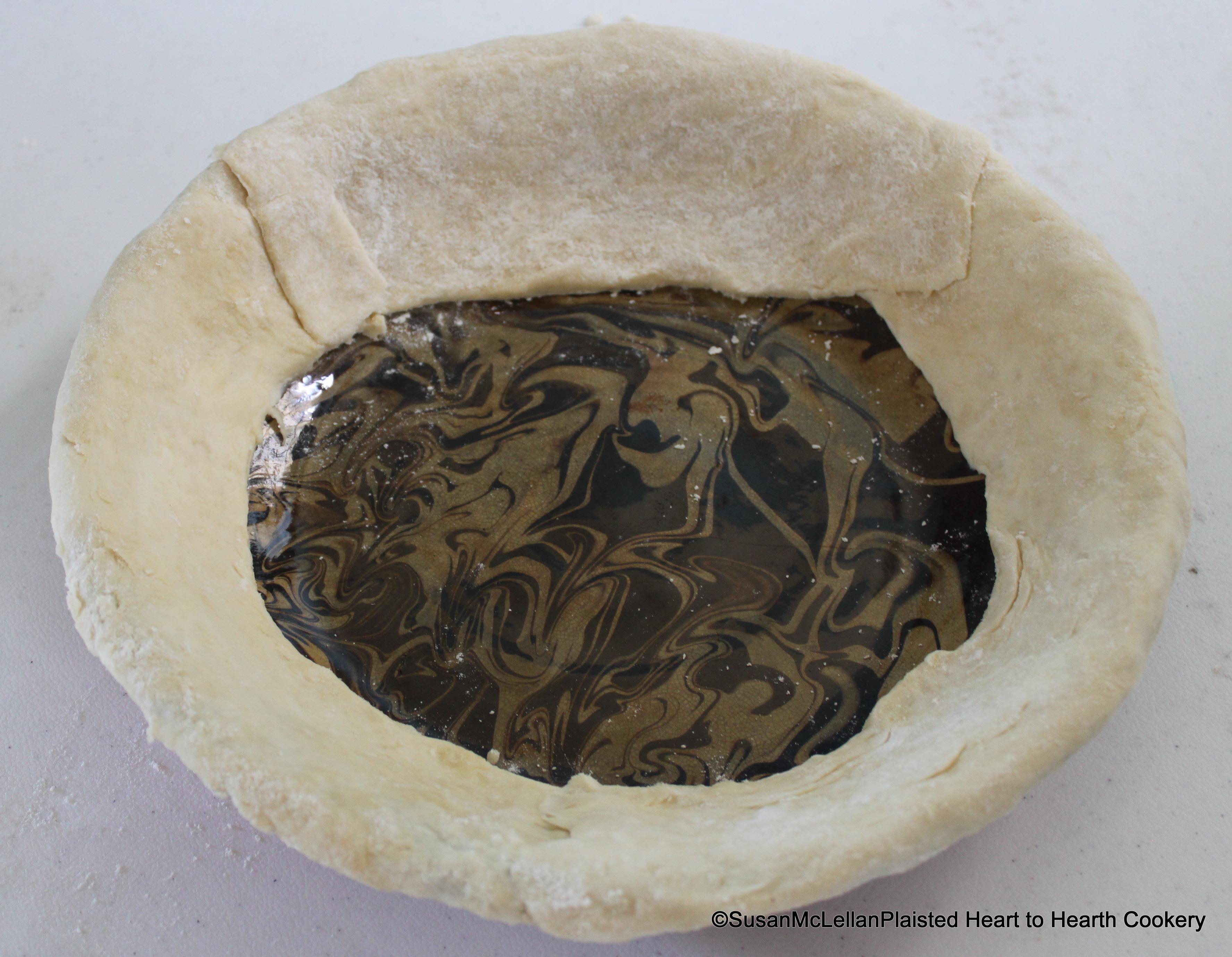After the brandy, sack and orange flower water have been added to the cooled ingredients for the receipt (recipe), To make a Marrow pudding, then have ready your dish rimmed with puff-paste.