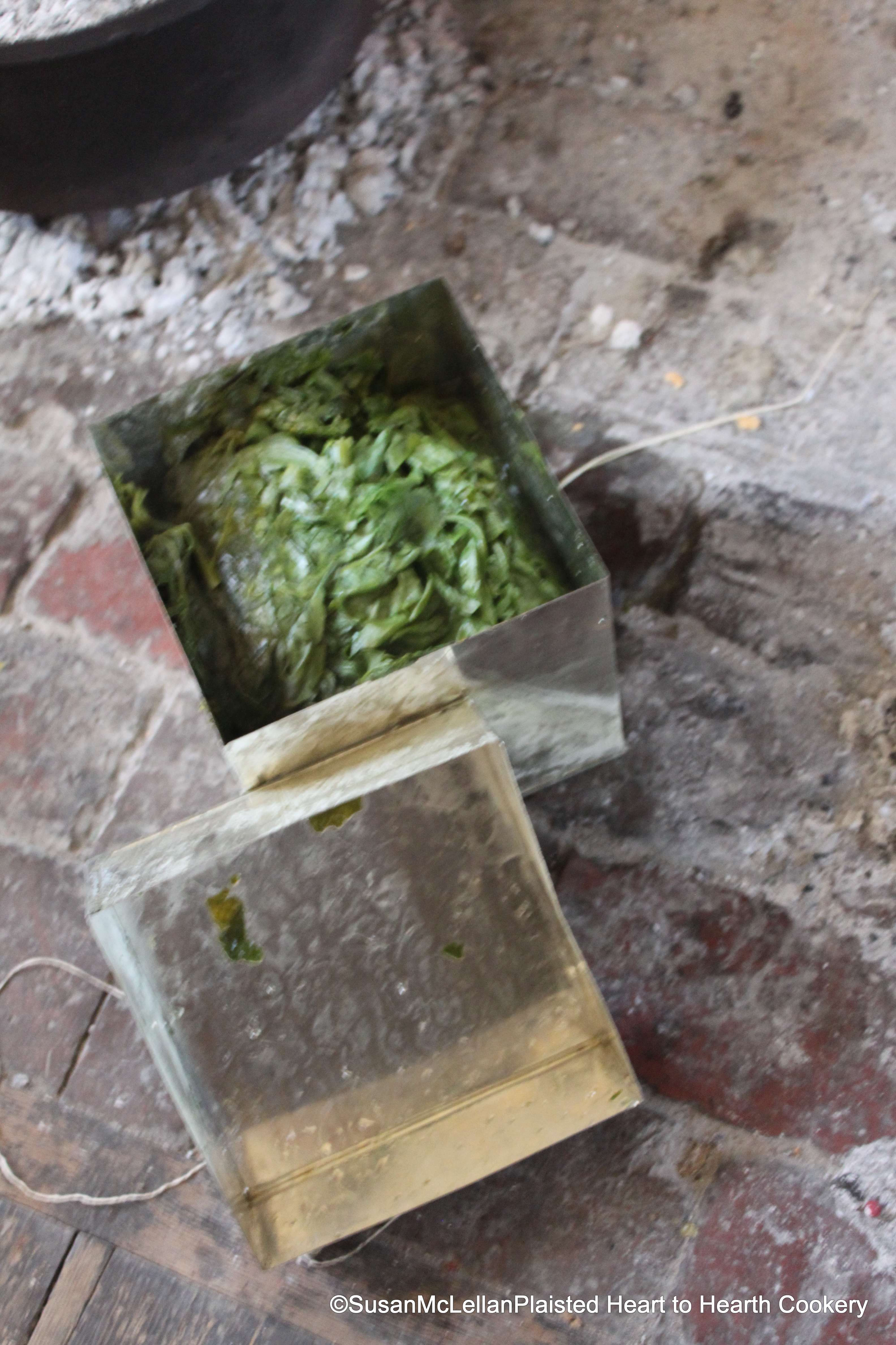 The receipt (recipe) for To boil Spinage, when you have not Room on the Fire to do it be itself, states it will take about an hour if the pot or copper boils. When the tin lid was removed from the box, the spinach was done to perfection.